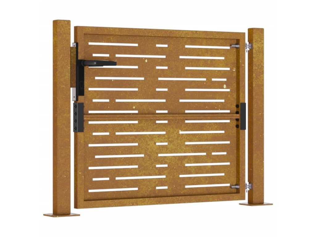 - Odolná konstrukce: Tato zahradní branka je vyrobená z cortenové oceli. Cortenová ocel, také známá jako povětrnostně odolná ocel. Je ze své podstaty antikorozní. Při prvním vystavení atmosférickým podmínkám se na ní vytvoří rezavá ochranná vrstva proti korozi. Nemusíte ji tedy natírat. Tím ušetříte náklady na údržbu a opravy. Výrazný hnědý odstín cortenové oceli jistě upoutá pozornost. Povětrnostně odolná ocel je výjimečně odolná a obstojí ve zkoušce času.