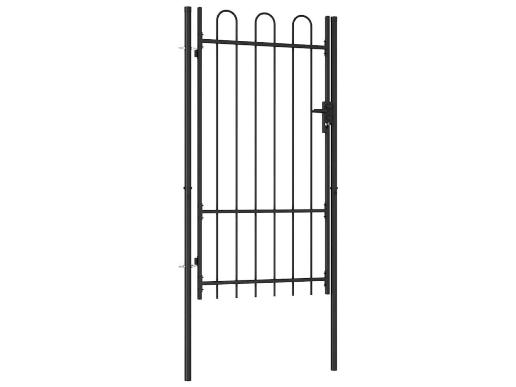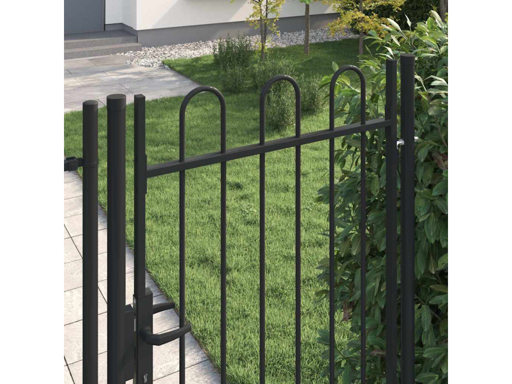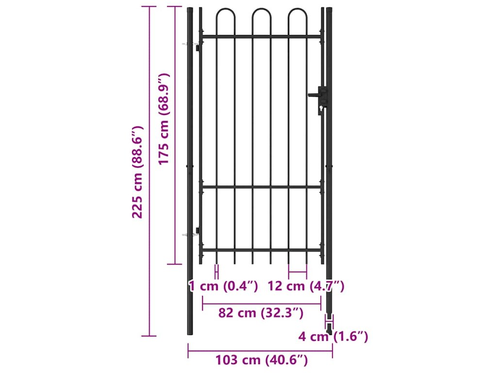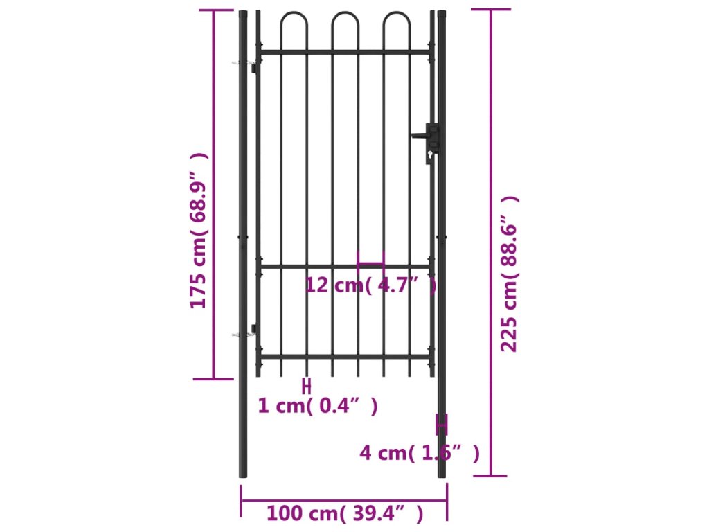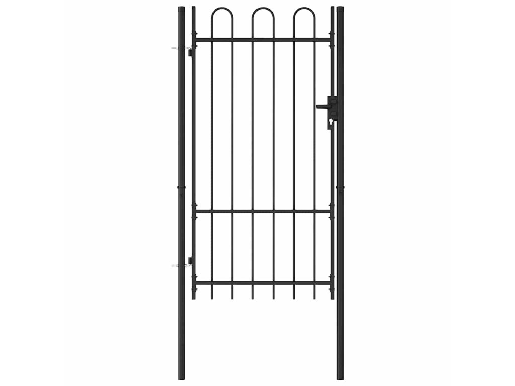 Zahradní branku tvoří svislé pruty nahoře zakončené obloukem a pevné vodorovné výztuhy, které rám zpevňují. Brána zaručuje vysoký stupeň soukromí a bezpečnosti a zároveň vytváří atraktivní vstup na váš pozemek. Je vyrobená z vysoce odolné oceli ošetřené práškovým lakem, který bránu chrání před rezavěním a korozí.