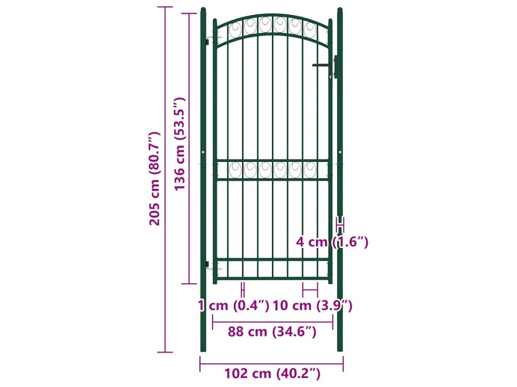 Elegantní zaoblený design naší branky je velmi atraktivní. Silné vodorovné příčky zpevňují její rám a zvyšují její bezpečnost. Branka tak tvoří působivý vstup na váš pozemek. Je vyrobená z vysoce odolné oceli a ošetřená práškovým lakem, který ji chrání před rzí a korozí. Zahradní branka je rovněž vybavena zamykacím systémem se třemi zahrnutými klíči. Dodáváme ji spolu se dvěma robustními sloupky s pevnými závěsy pro snadnou instalaci.