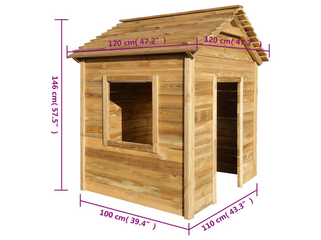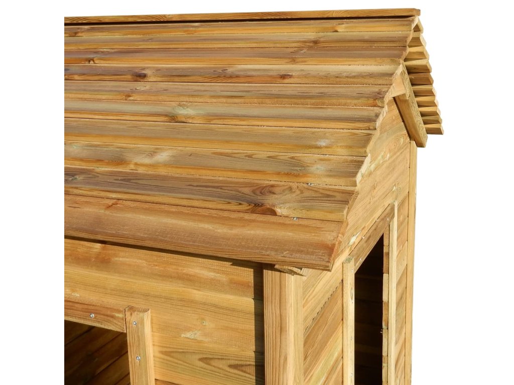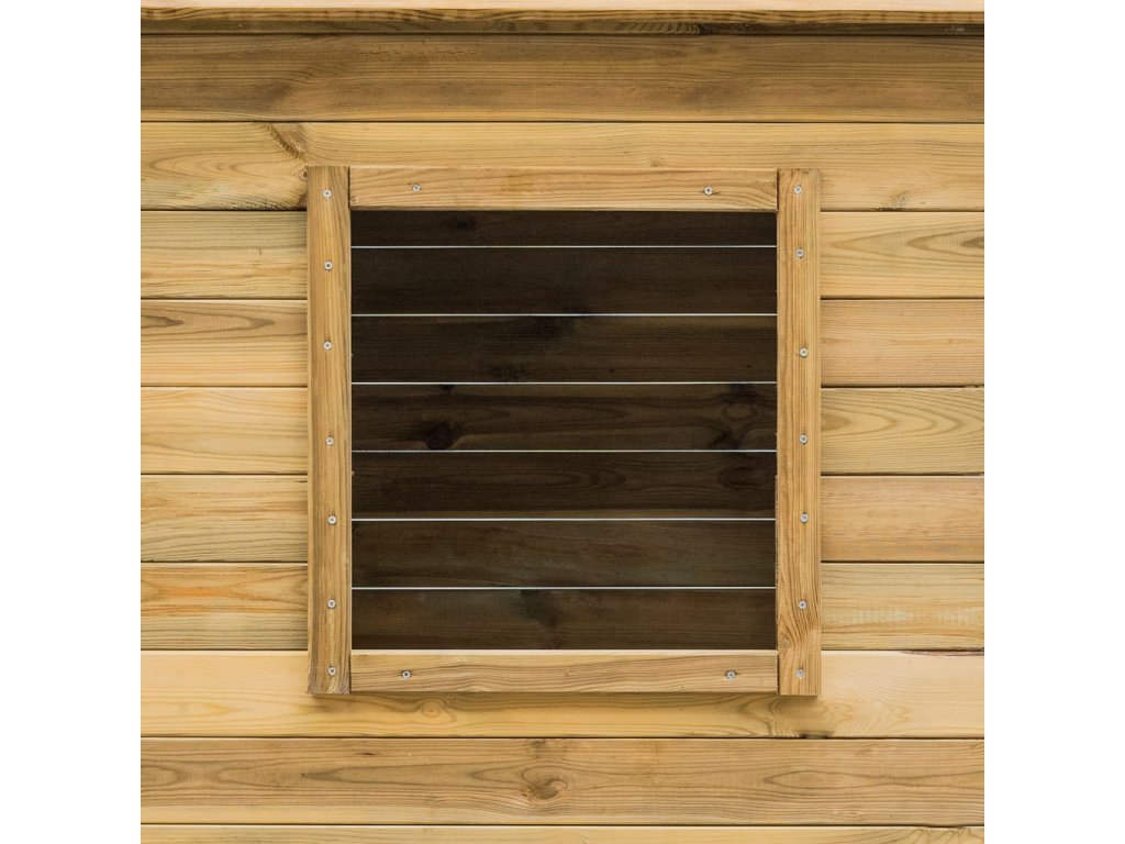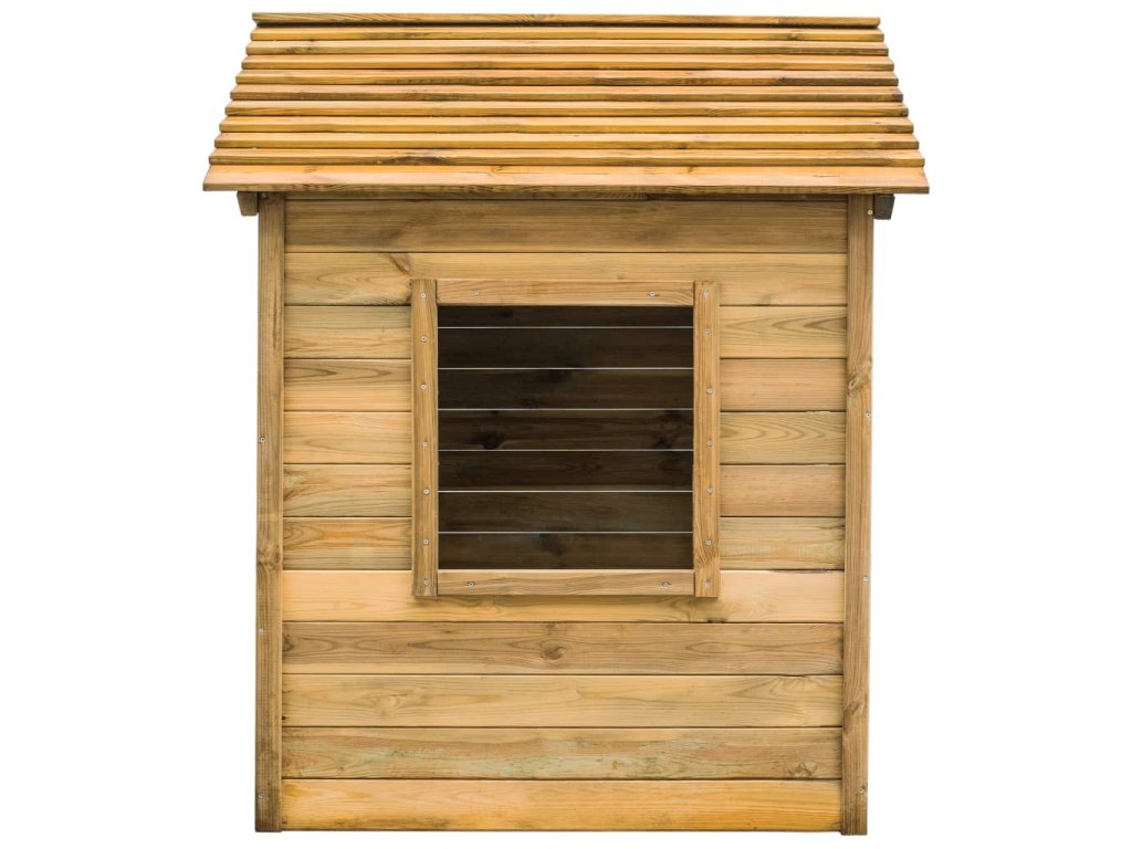 Zahradní domeček je vyrobený ze zeleně impregnované borovice, takže je stabilní, odolný a mimořádně pevný. Masivní zelené impregnované borové dřevo je odolné vůči hnilobě, hmyzu a nepříznivým povětrnostním vlivům. Domeček na hraní má otevřené okno a dveře, aby se dovnitř dostalo přirozené světlo. Vaše děti si sem mohou přinést své hračky a oblíbené poklady a hrát si v domečku a jeho okolí!