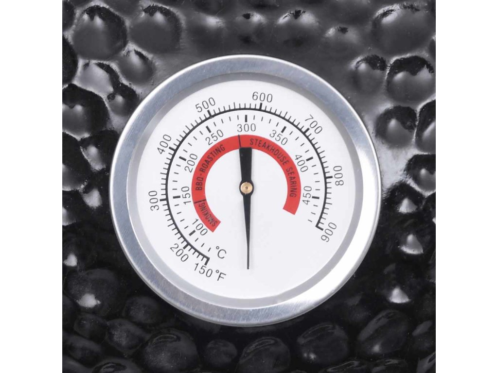 Keramický gril má velmi robustní odklápěcí víko s větracím otvorem a vestavěným teploměrem. Díky vrstvené ventilaci lze snadno řídit přívod vzduchu i teplotu. Vysoce kvalitní keramika s glazurovaným pórovitým povrchem je nejen odolná a esteticky příjemná, ale zaručuje také unikátní vlastnosti pro přípravu chutných, jemně propečených pokrmů! Nohy z práškově lakované oceli přispívají ke stabilitě grilu.