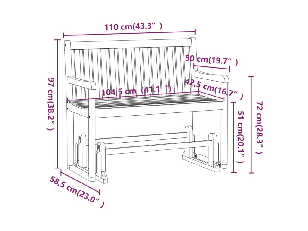 Lavice je vyrobena z masivního akáciového dřeva, tropického tvrdého dřeva s olejovou povrchovou úpravou, takže je odolná vůči povětrnostním vlivům, velmi dlouho vydrží a je vhodná pro venkovní použití. Na této výrazné lavici se můžete pohodlně houpat tam a zpět a užít si chvíle odpočinku s přáteli nebo rodinou.
