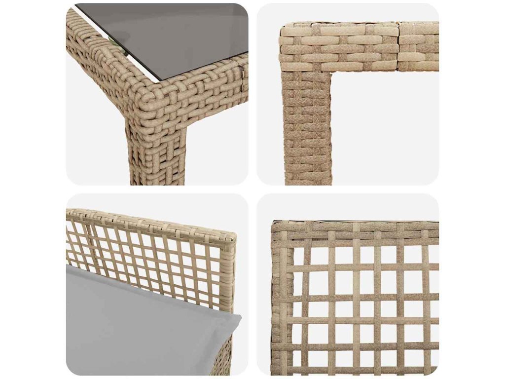 - Vysoce kvalitní poly ratan: Tato souprava je vyrobená z odolného poly ratanu, který zvládá různý počasí a každodenní používání. Její tkaný vzhled dodává chic atmosféru, která se hodí do každé zahrady a dává vám pohodlí díky chytrému designu.