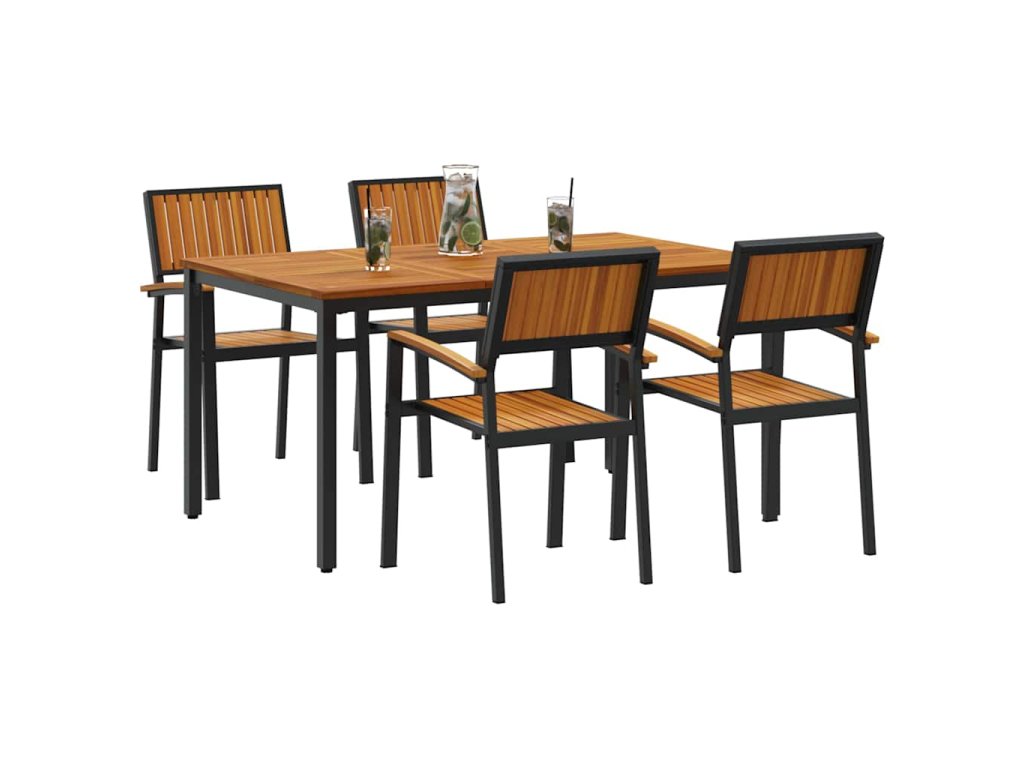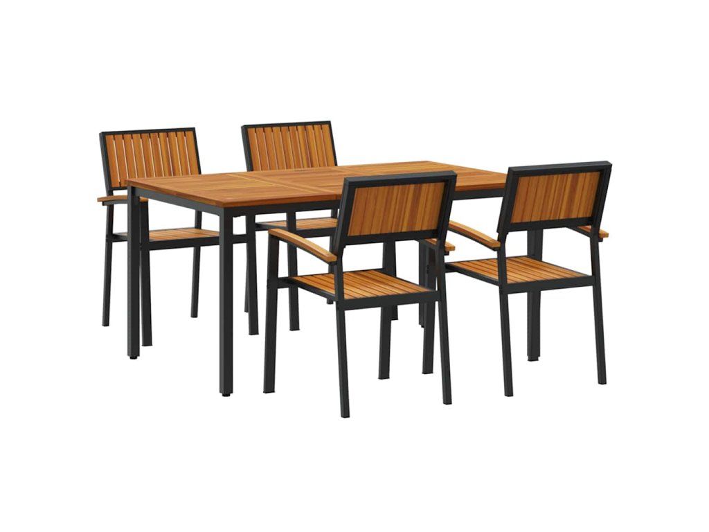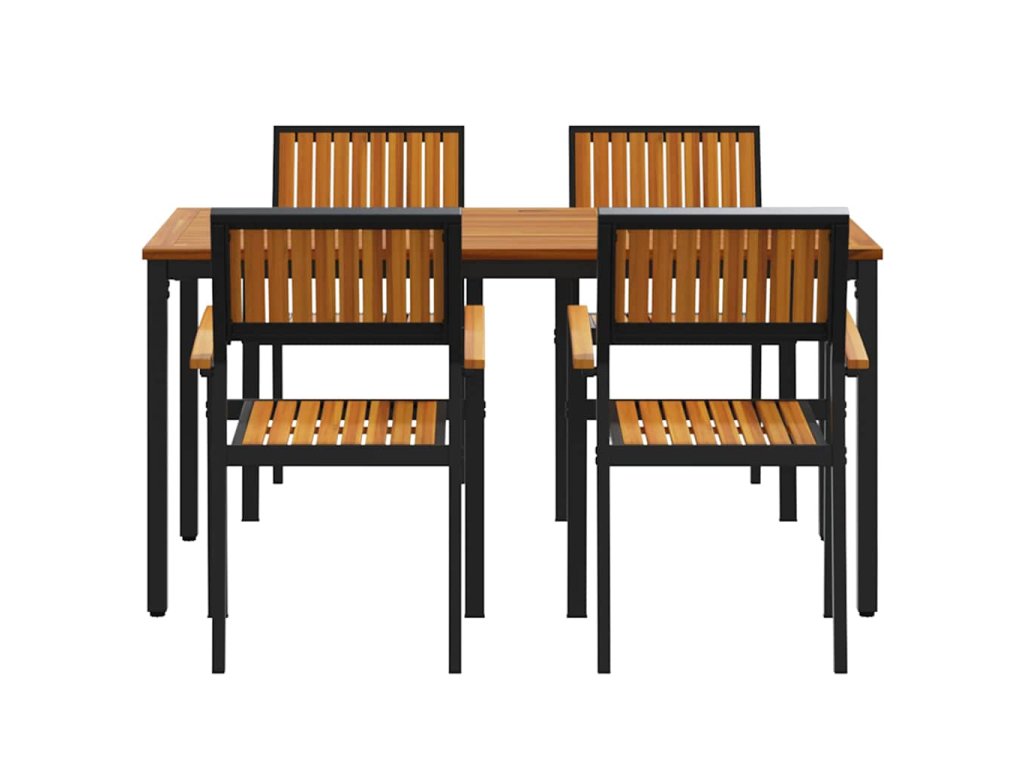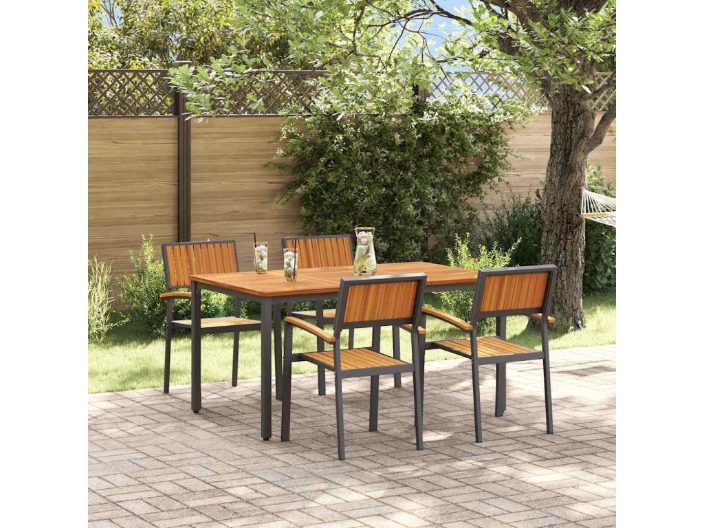 Tento 5dílný zahradní jídelní set spojuje pevný kov s krásným akáciovým dřevem. Skvěle vypadá v každém venkovním prostoru. Ideální pro rodinné akce nebo posezení s kamarády, přináší svěží a stylovou atmosféru, zatímco zůstává praktický a trvanlivý.