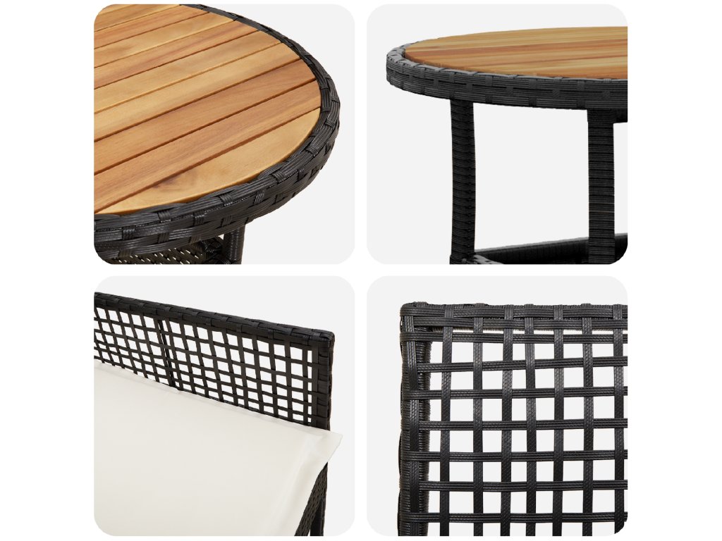 - Stůl a židle jsou vyrobené z odolného syntetického ratanu a polyesteru, co spojují styl s funkcí, aby odolaly počasí.