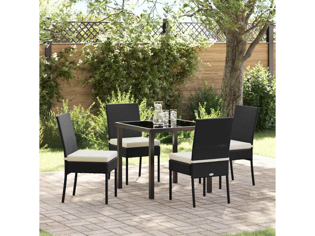- Součásti: Souprava zahrnuje skleněnou desku stolu, která dodává elegance a snadno se udržuje. Tkaná opěra z polyratanu nabízí styl a pohodlí, zatímco polyesterové polštáře mají zipy pro jednoduchou údržbu. Černý práškově lakovaný ocelový rám to všechno spojuje a zajišťuje spolehlivost po mnoho let.