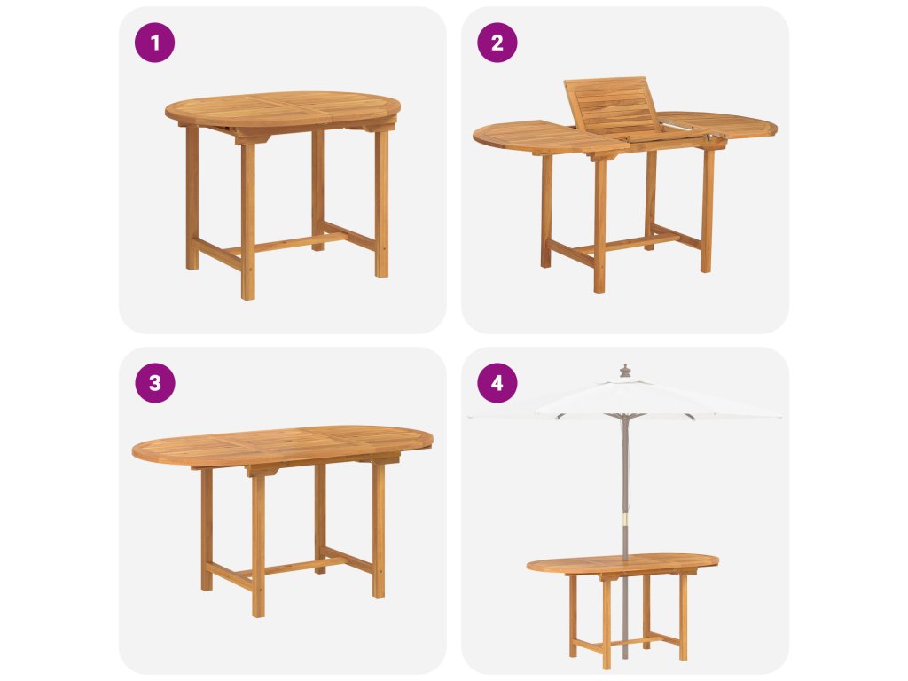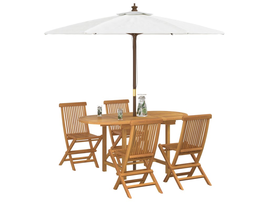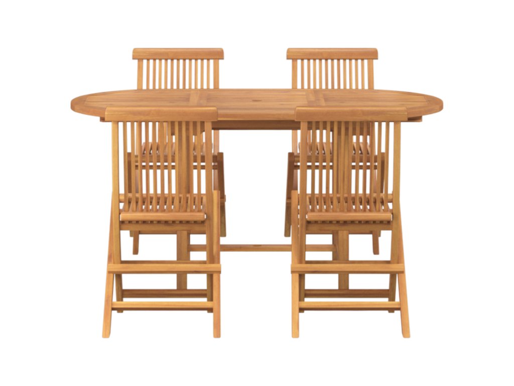 Toto 5dílné zahradní jídelní soupravy z masivního teakového dřeva spojí styl a praktičnost a oživí jakoukoli venkovní plochu. Moderní oválný design skvěle ladí s krásnými hladkými dřevěnými povrchy, které vytvářejí příjemnou atmosféru ideální pro jídlo a společenské setkání s rodinou a přáteli.