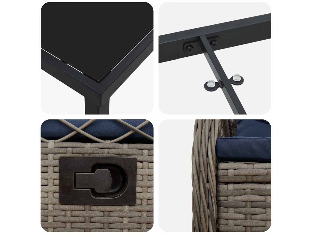 - Součásti: Souprava se dodává s robustními ocelovými nohami pro stabilitu a poly ratanovými opěradly a sedadly pro extra pohodlí. Ať už jíte, nebo jen odpočíváte, tyto součásti dělají zážitek příjemným s ideálním mixem funkce a relaxace.