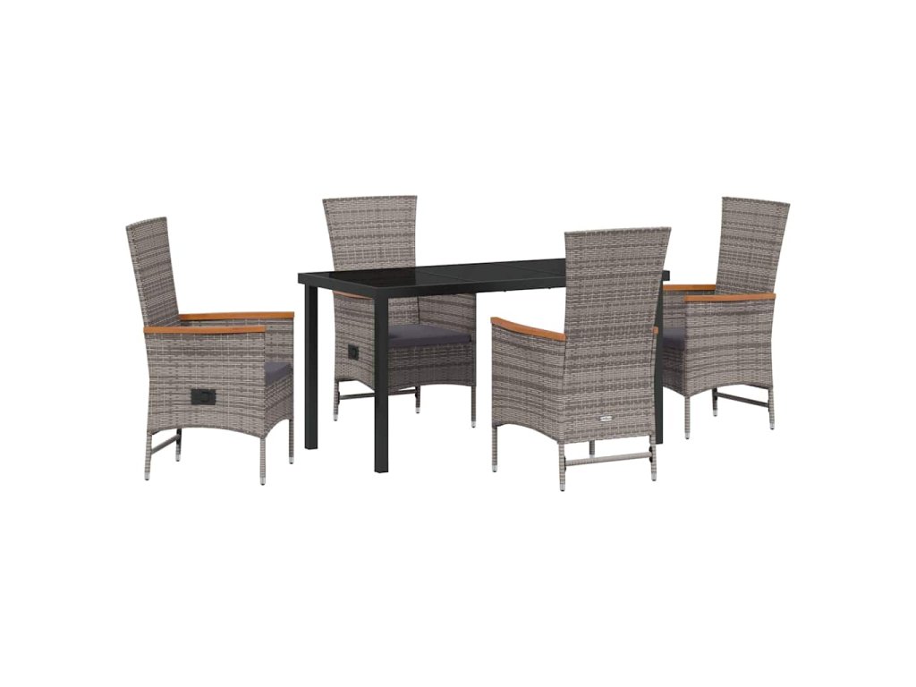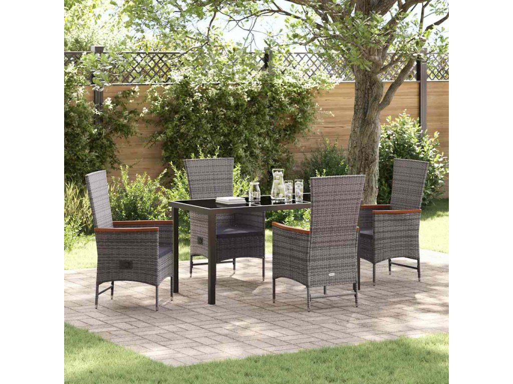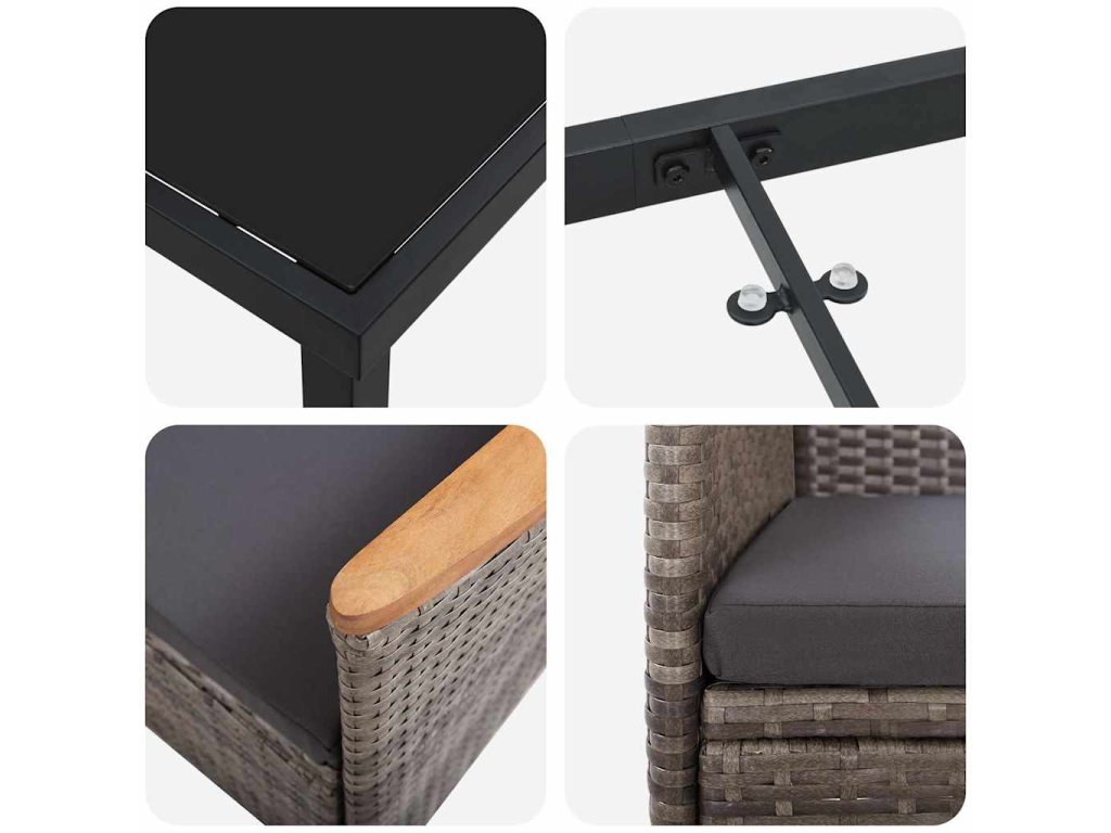 Tento zahradní jídelní set spojuje moderní design s praktickými funkcemi a vytváří tak příjemné prostředí pro venkovní aktivity. S konstrukcí z práškově lakované oceli, tvrzeného skla a pleteného polyratanu je nejen krásný, ale i velmi užitečný. Jeho elegantní linie se skvěle hodí na jakoukoliv zahradu nebo terasu a stává se perfektním místem pro setkání s rodinou a přáteli.