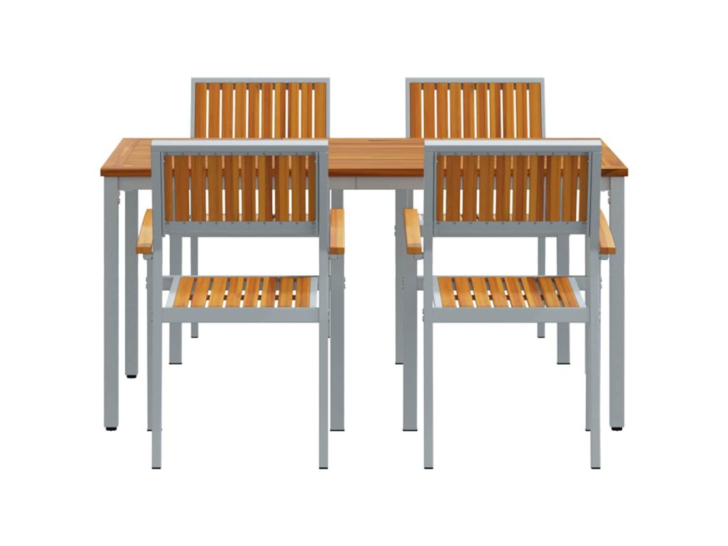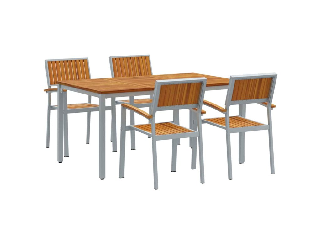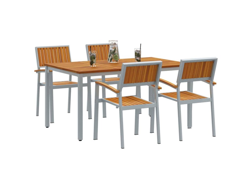 Tenhle zahradní jídelní set spojuje odolný kov s teplým akáciovým dřevem, ideální na jakoukoli venkovní akci. Perfektní na elegantní večeře na patiu nebo uvolněná posezení na zahradě, přináší styl a užitečnost do vašeho venkovního života.