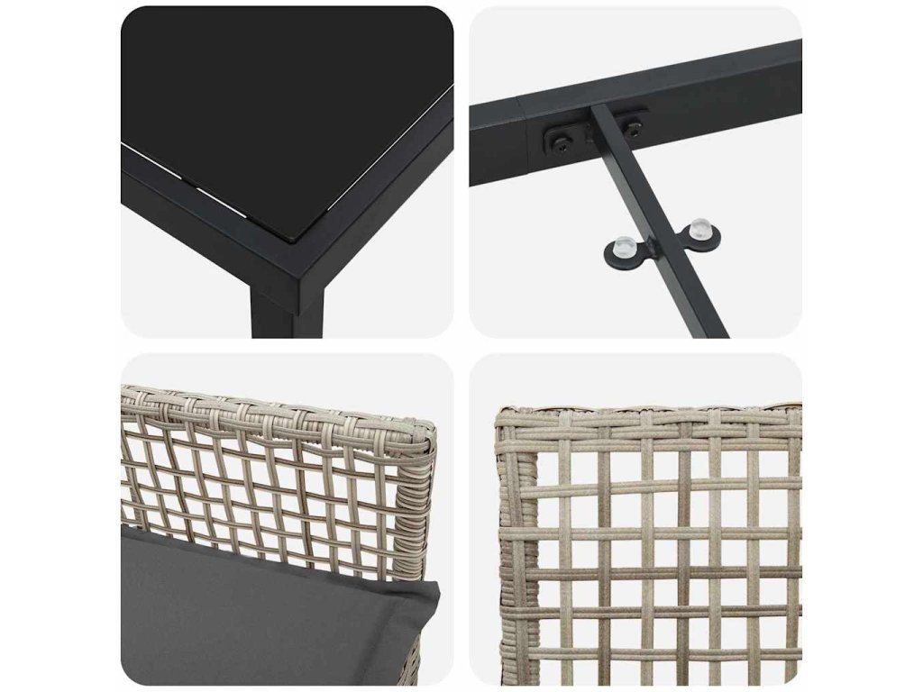 - Kompletní součásti: Set se silným rámem z práškově lakované oceli je pořádně pevnej. S poly ratanovými opěrkami a tvrzeným skleněným stolkem máme stylový a praktický místo na jídlo. Polštáře jsou s pěnovým plněním a dají se klidně sundat, aby se v pohodě posedělo.