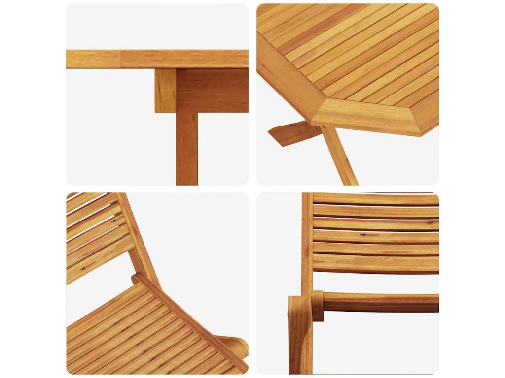 - Premium akáciové dřevo: Sada je vyrobena z vysoce kvalitního akáciového dřeva, které je známé svou trvanlivostí a přirozenou odolností proti povětrnostním vlivům. Tento odolný materiál nabízí sílu a teplo, čímž zvýrazňuje rustikální kouzlo vašeho venkovního prostoru. Jeho bohatý olejovaný povrch nejen chrání před vlhkostí, ale také zdůrazňuje přirozenou texturu dřeva, zajišťující estetiku a dlouhověkost.