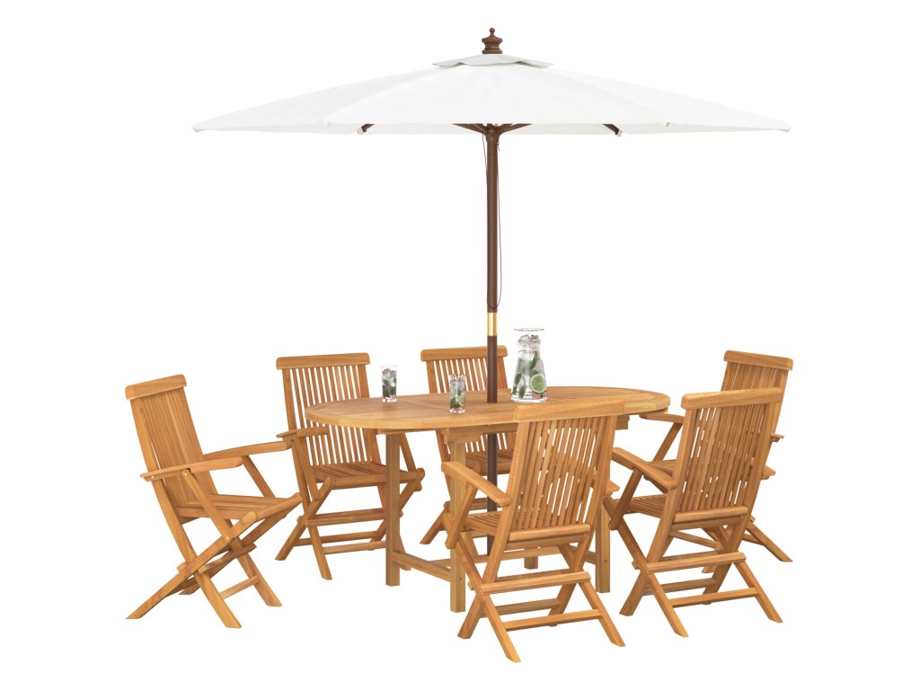 Tento set pro venkovní stolování z přírodního teakového dřeva je skvělá volba pro každou venkovní plochu, ideální na letní párty a rodinné jídlo. Jeho oválný tvar a masivní teakové dřevo z něj dělají nejen stylový, ale i odolný kousek, který skvěle poslouží na venkovní stolování.