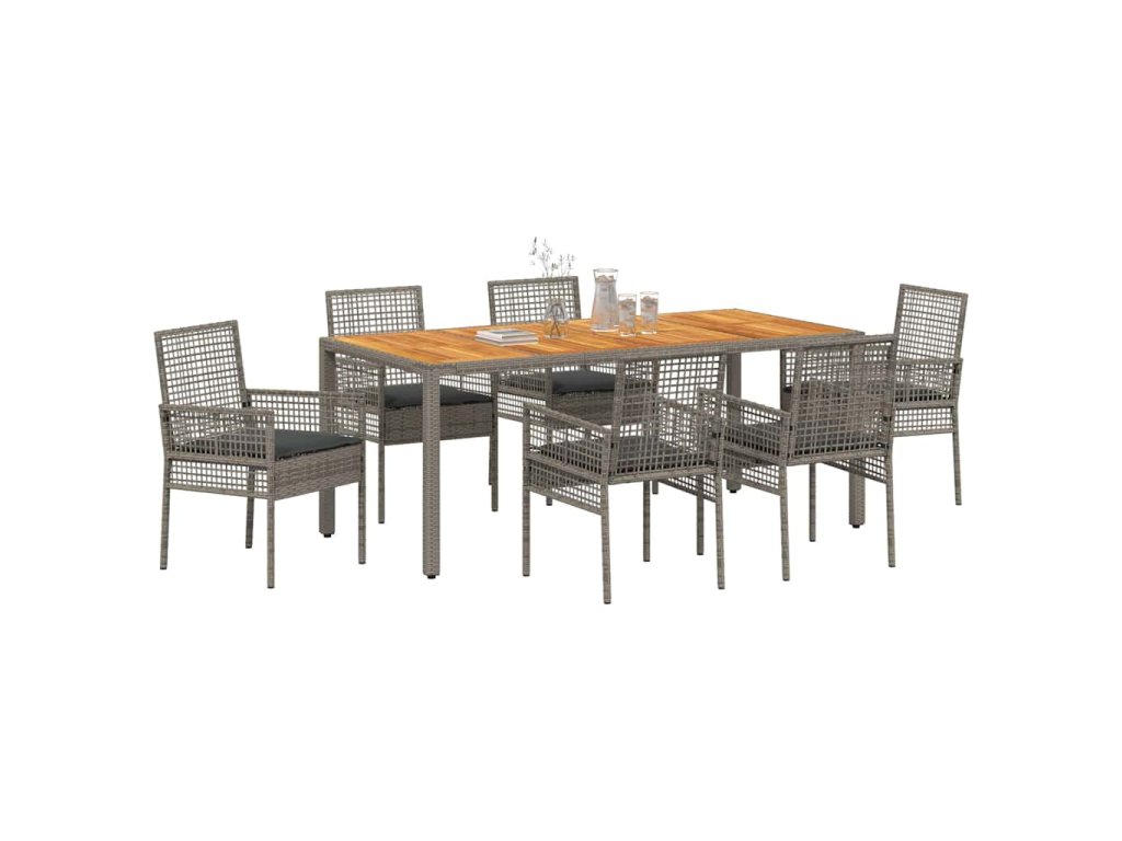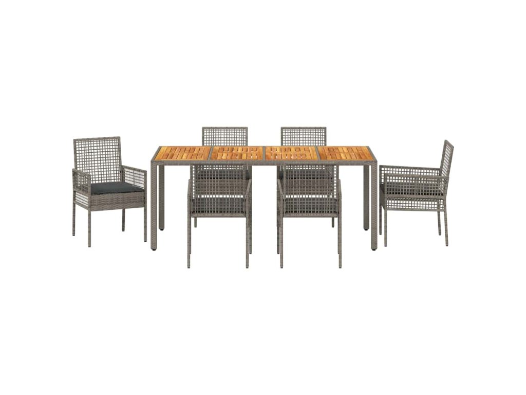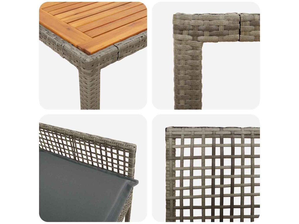 - Materiály: Tato zahradní jídelní souprava z polyratanu má hladký povrch, který spojuje moderní styl s trvanlivostí. Polyratan je vybrán pro svou odolnost vůči špatnému počasí, takže si udržuje vzhled a strukturu i v různých ročních obdobích. Tento materiál dodává stylový, moderní dojem, zatímco je flexibilní a zabraňuje prasklinám nebo zlomeninám.