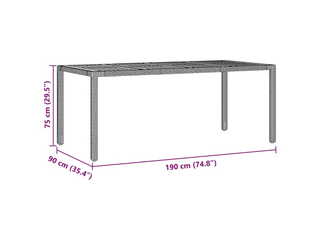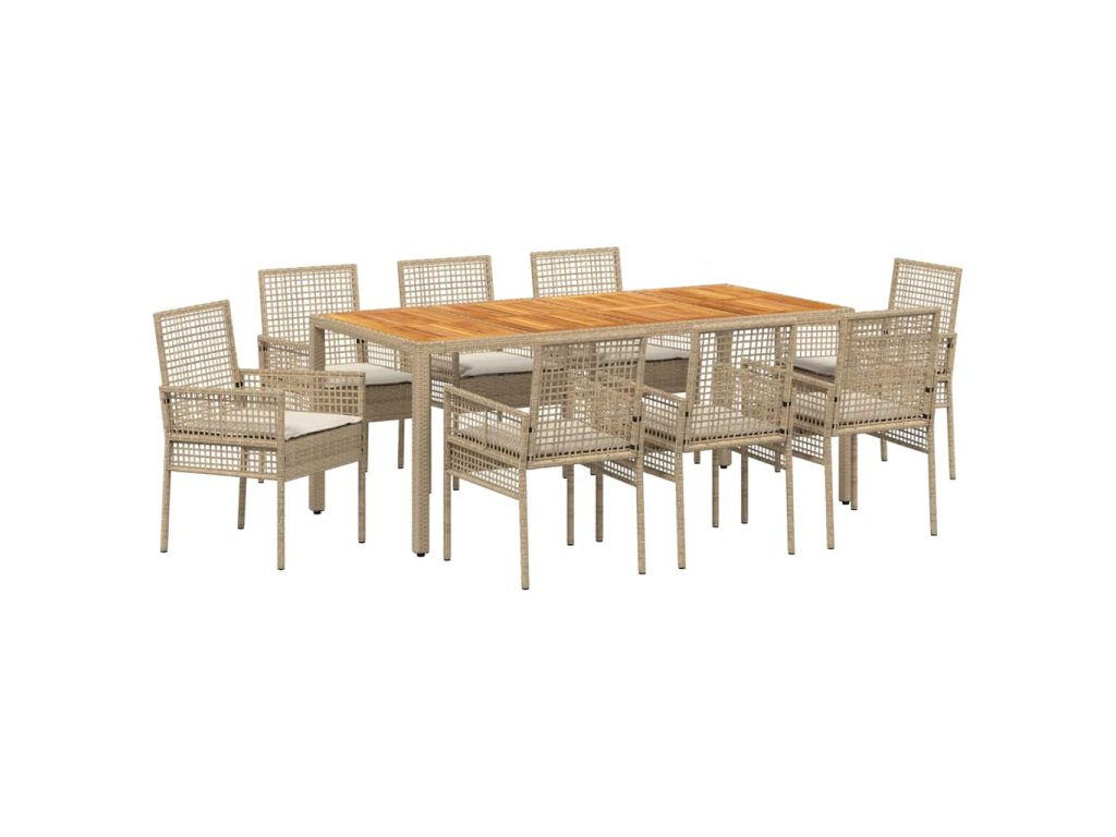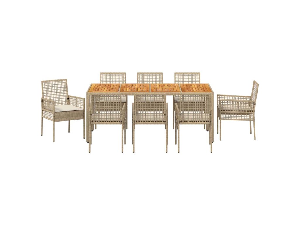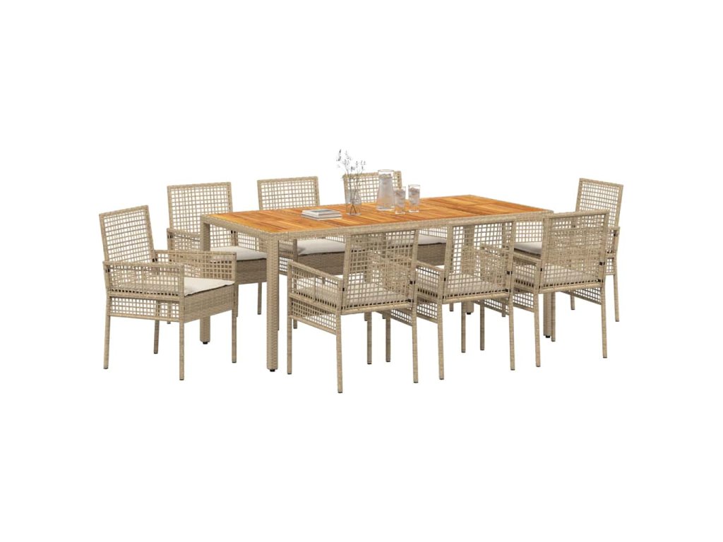 - Materiály: Tato zahradní jídelní souprava z polyratanu má hladký povrch, který spojuje moderní styl s trvanlivostí. Polyratan je vybrán pro svou odolnost vůči špatnému počasí, takže si udržuje vzhled a strukturu i v různých ročních obdobích. Tento materiál dodává stylový, moderní dojem, zatímco je flexibilní a zabraňuje prasklinám nebo zlomeninám.