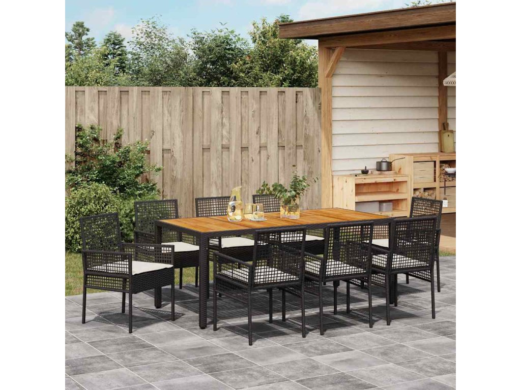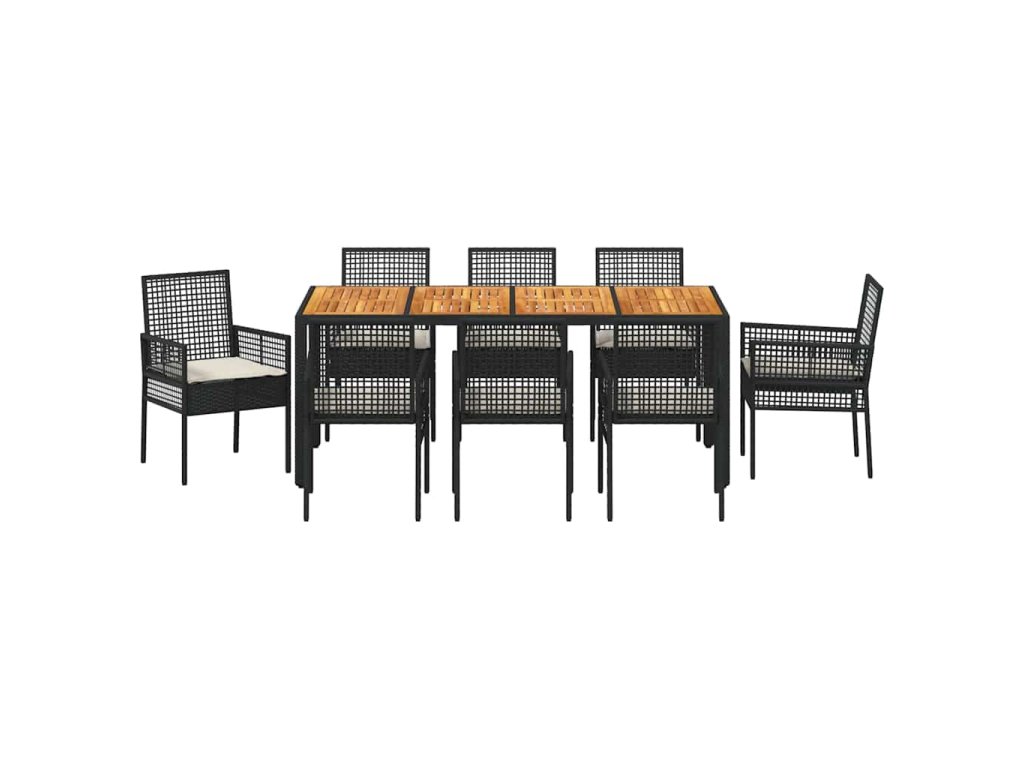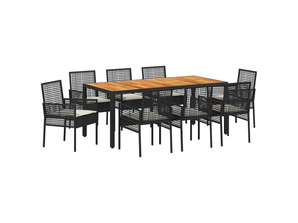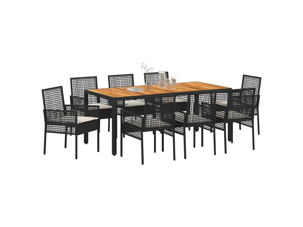 - Materiály: Tato zahradní jídelní souprava z polyratanu má hladký povrch, který spojuje moderní styl s trvanlivostí. Polyratan je vybrán pro svou odolnost vůči špatnému počasí, takže si udržuje vzhled a strukturu i v různých ročních obdobích. Tento materiál dodává stylový, moderní dojem, zatímco je flexibilní a zabraňuje prasklinám nebo zlomeninám.