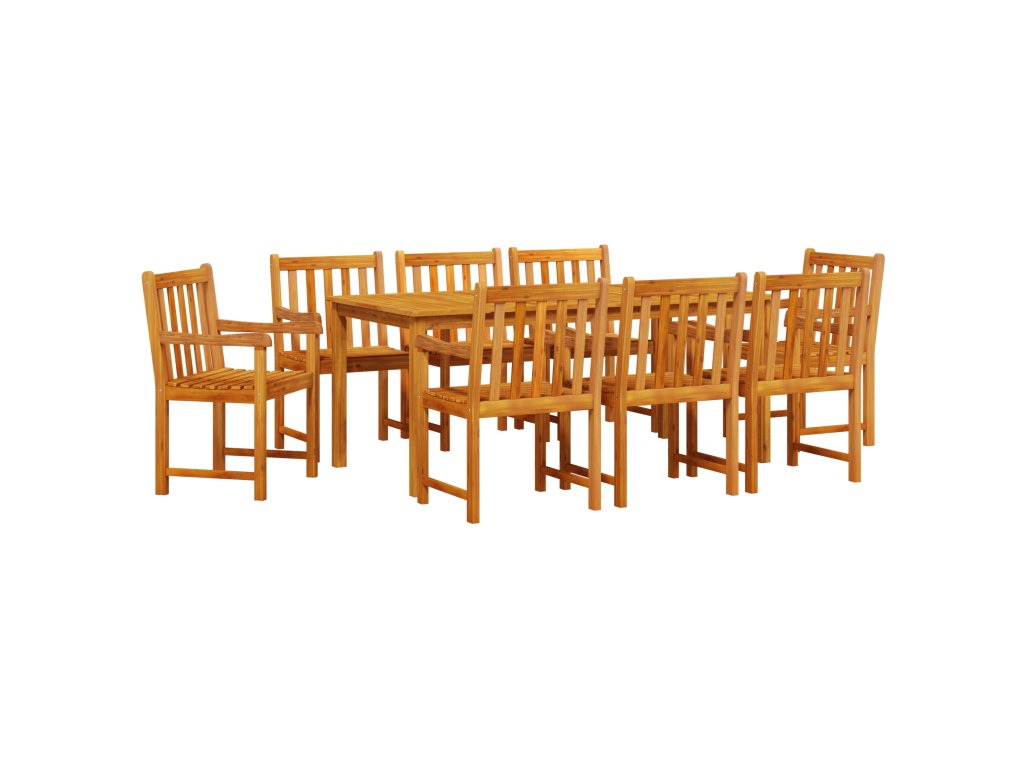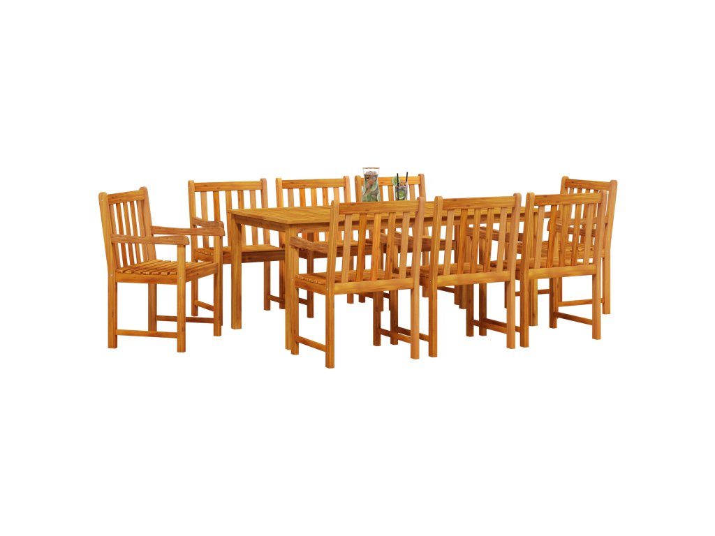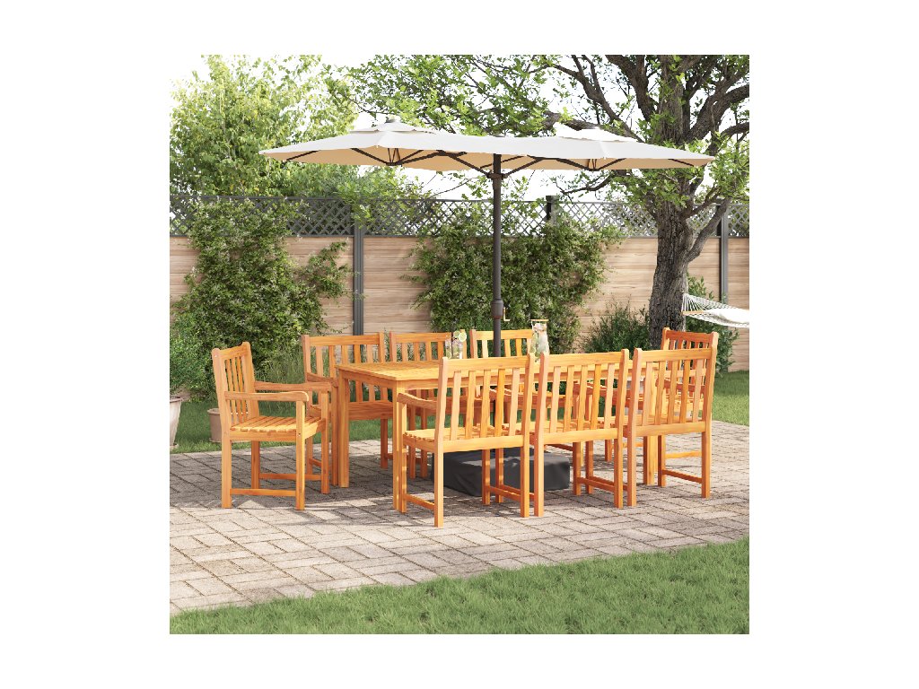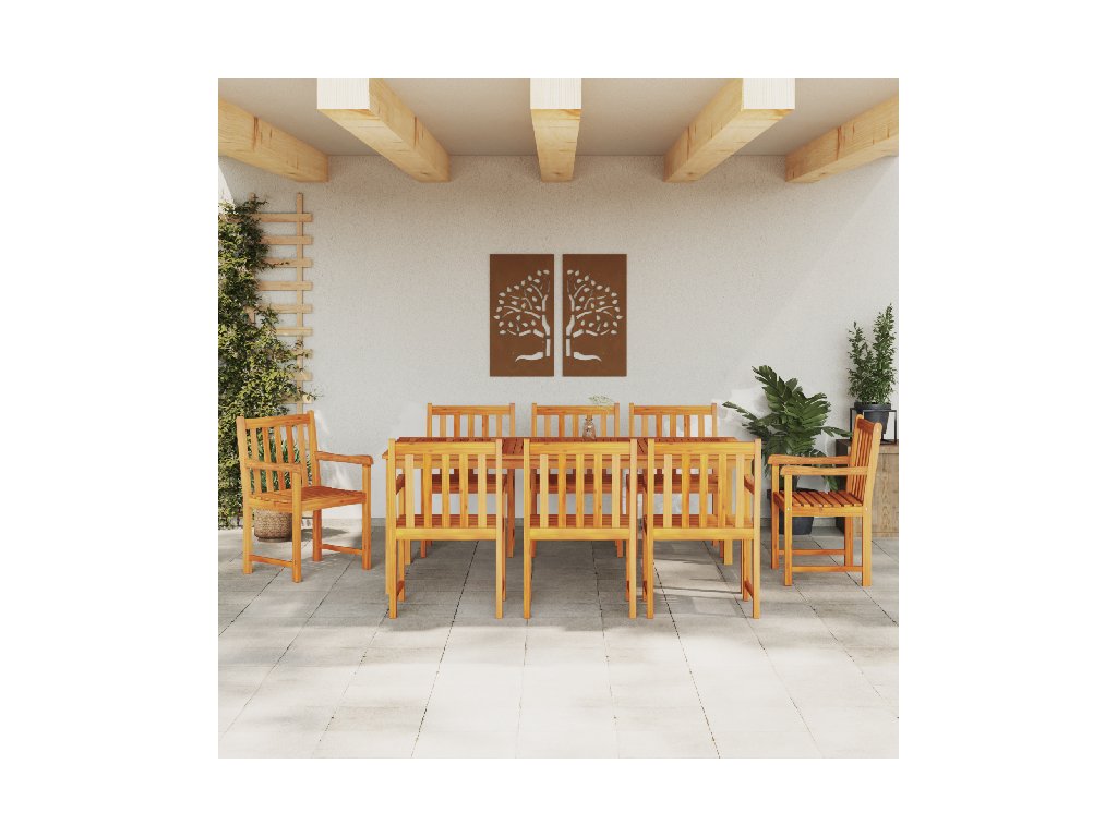 Tato rustikální sada jídelních stolů pro 8 lidí je navržená pro pohodlné a stylové venkovní stolování. S použitím masivního akáciového dřeva vytváří krásný a útulný prostor pro rodinné setkání nebo letní jídla. Představ si slunné odpoledne strávené s rodinou, obklopený zelení a smíchem, který dělá venkovní stolování ještě víc radostné.
