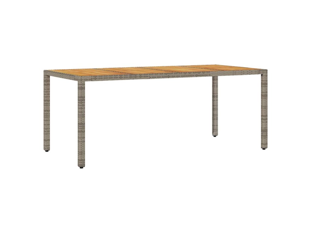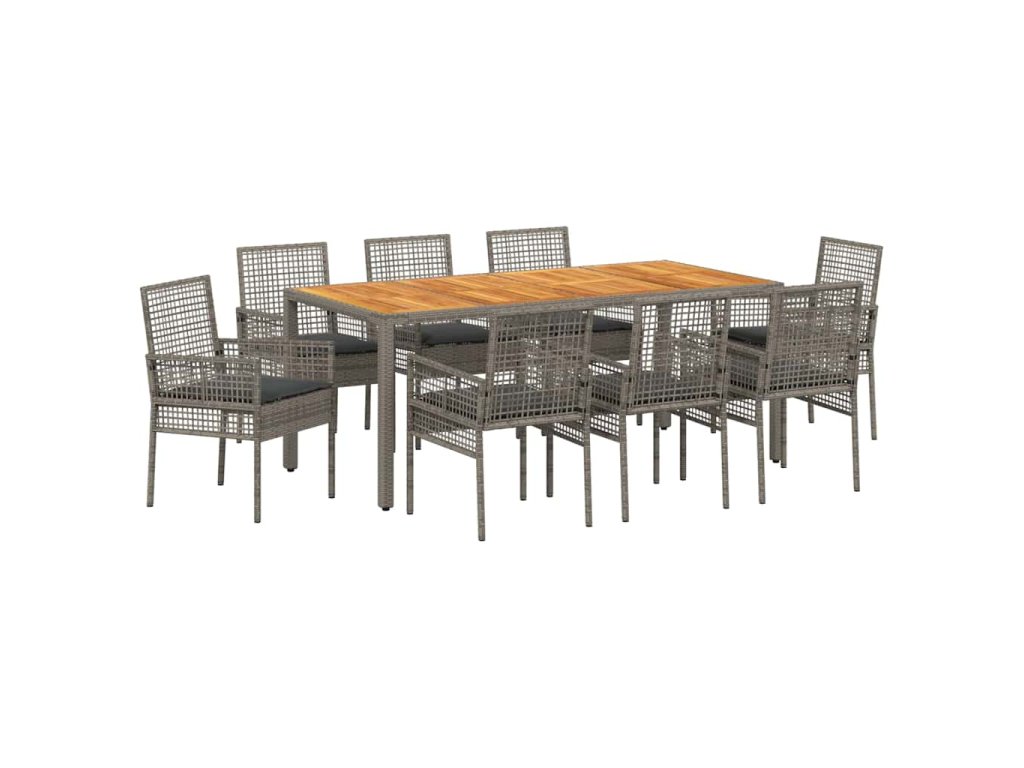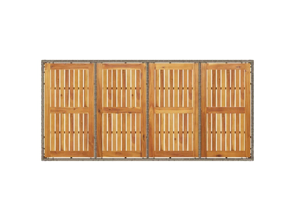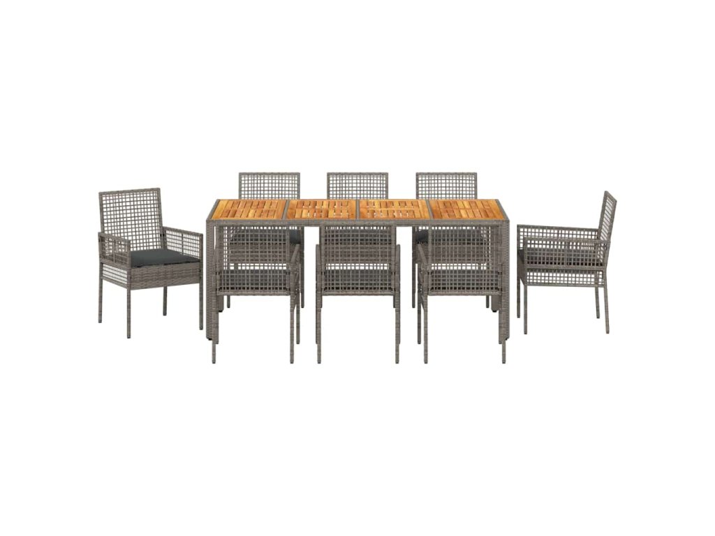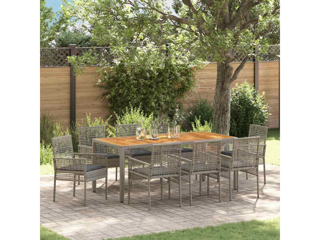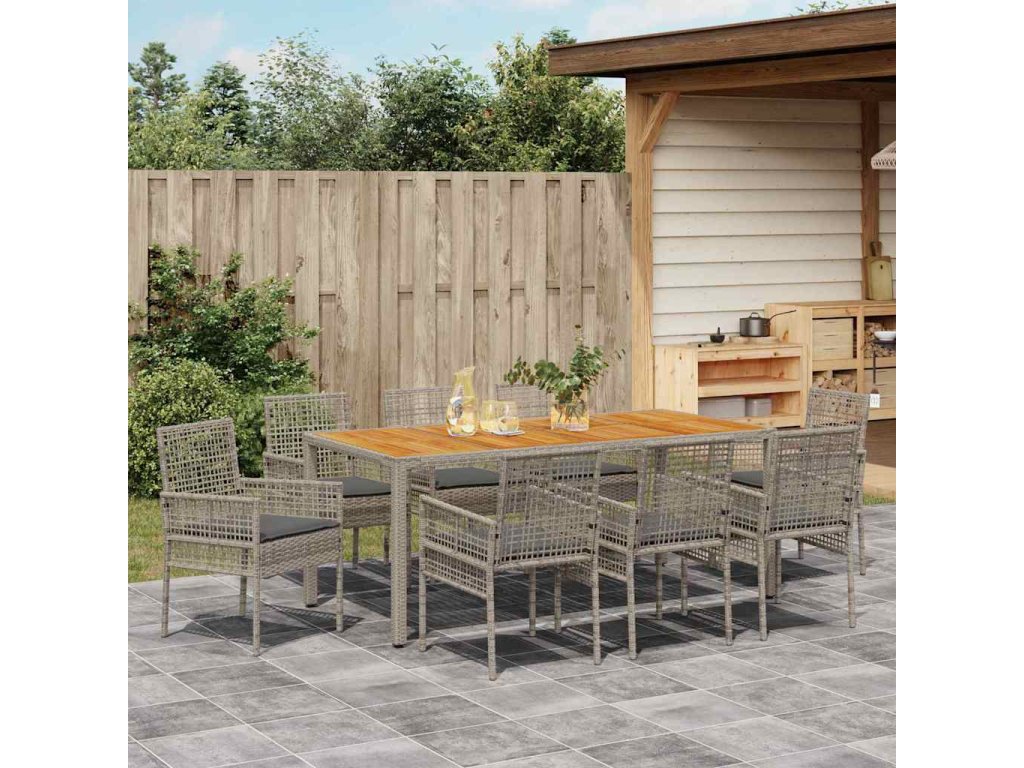 - Materiály: Tato zahradní jídelní souprava z polyratanu má hladký povrch, který spojuje moderní styl s trvanlivostí. Polyratan je vybrán pro svou odolnost vůči špatnému počasí, takže si udržuje vzhled a strukturu i v různých ročních obdobích. Tento materiál dodává stylový, moderní dojem, zatímco je flexibilní a zabraňuje prasklinám nebo zlomeninám.