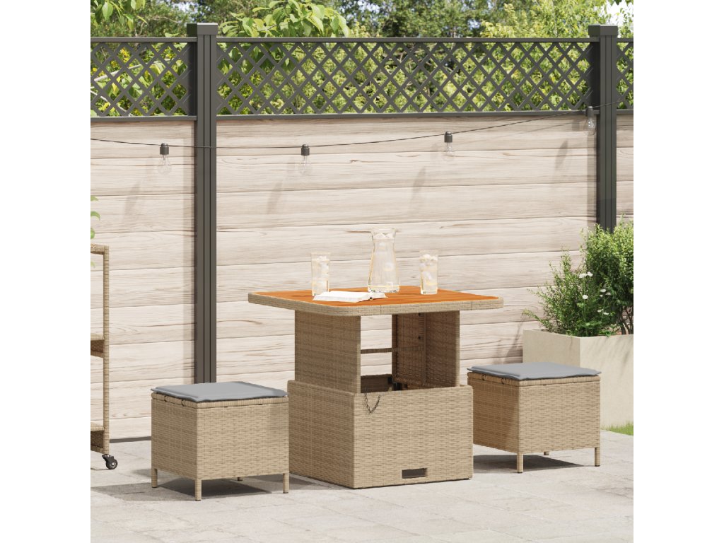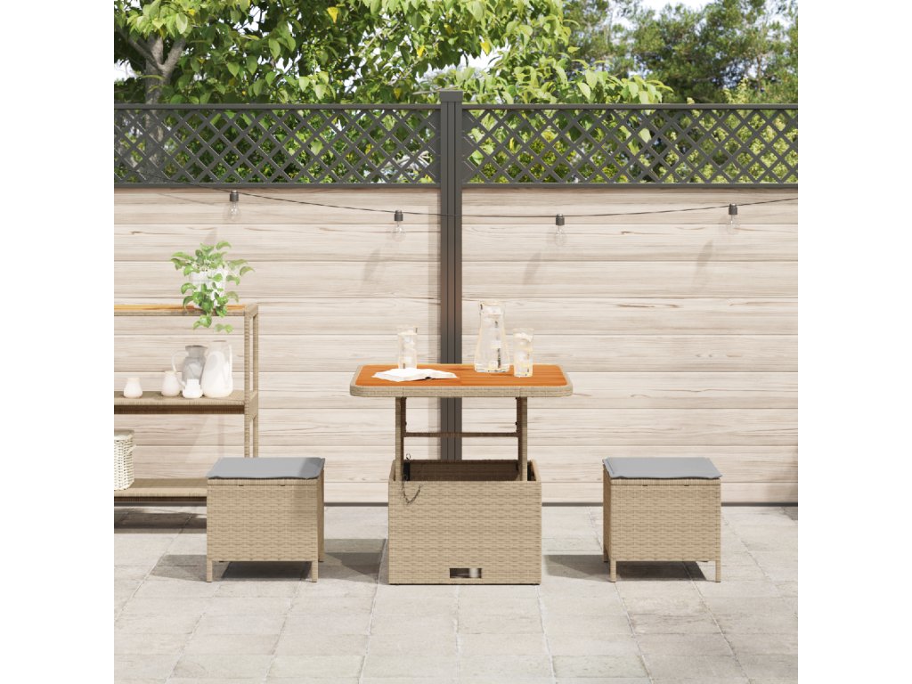 - Stylová konstrukce: Jídelní set spojuje moderní styl s praktičností, elegantní ratanový povrch a odpovídající stoličky vytvářejí přátelskou venkovní atmosféru. Jeho neutrální barvy sedí k různým stylům.