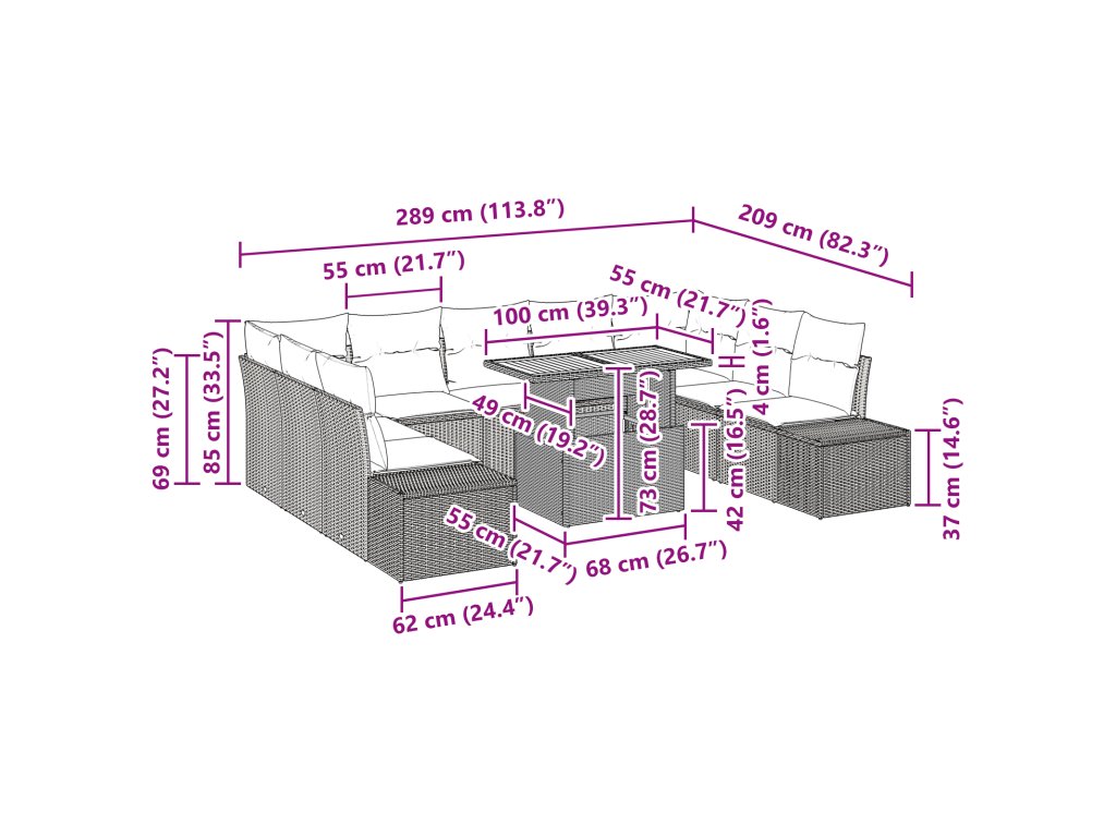 - Dodání obsahuje: 2 x boční pohovku včetně úložného prostoru, 2 x rohové sedadlo včetně úložného prostoru, 5 x centrální sedadlo včetně úložného prostoru, 1 x zahradní stůl