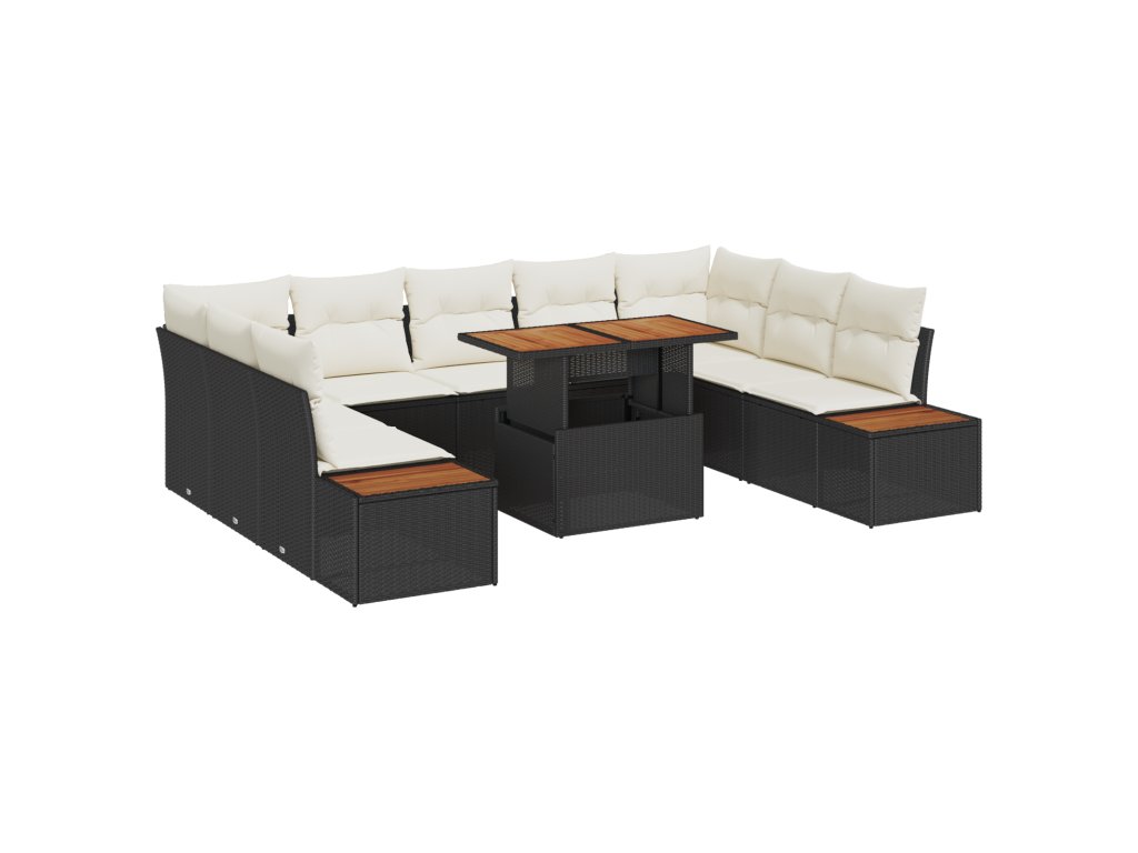 Tahle 10dílná zahradní jídelní souprava mísí styl s praktickou funkcionalitou, navržena tak, aby vaše venkovní chvíle byly skvělé. S elegantním černým poly ratanovým rámem a měkkými béžovými polštáři má moderní vzhled, ideální pro společenské akce, lenošení odpoledne nebo rodinné jídlo venku, pohodlně pojme až pět lidí s extra místem, když je potřeba.