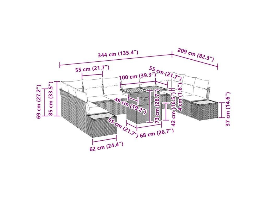 - Dodávka obsahuje: 2 x Boční pohovka s úložným prostorem, 2 x Rohové sedadlo s úložným prostorem, 6 x Centrální sedadlo s úložným prostorem, 1 x Zahradní stůl