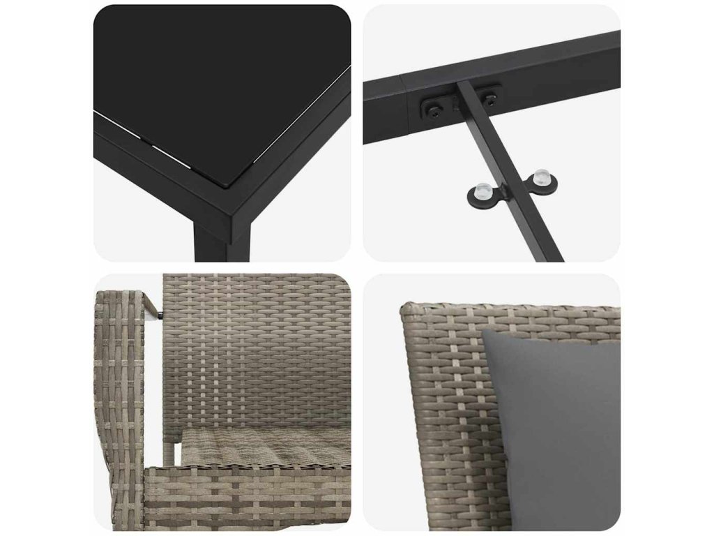 - Materiál Poly Ratan: Tento nábytkový set je vyroben z prvotřídního poly ratanového materiálu, který je známý pro svou odolnost a příjemný pocit. Odolá všem podmínkám a vypadá pěkně dlouho.