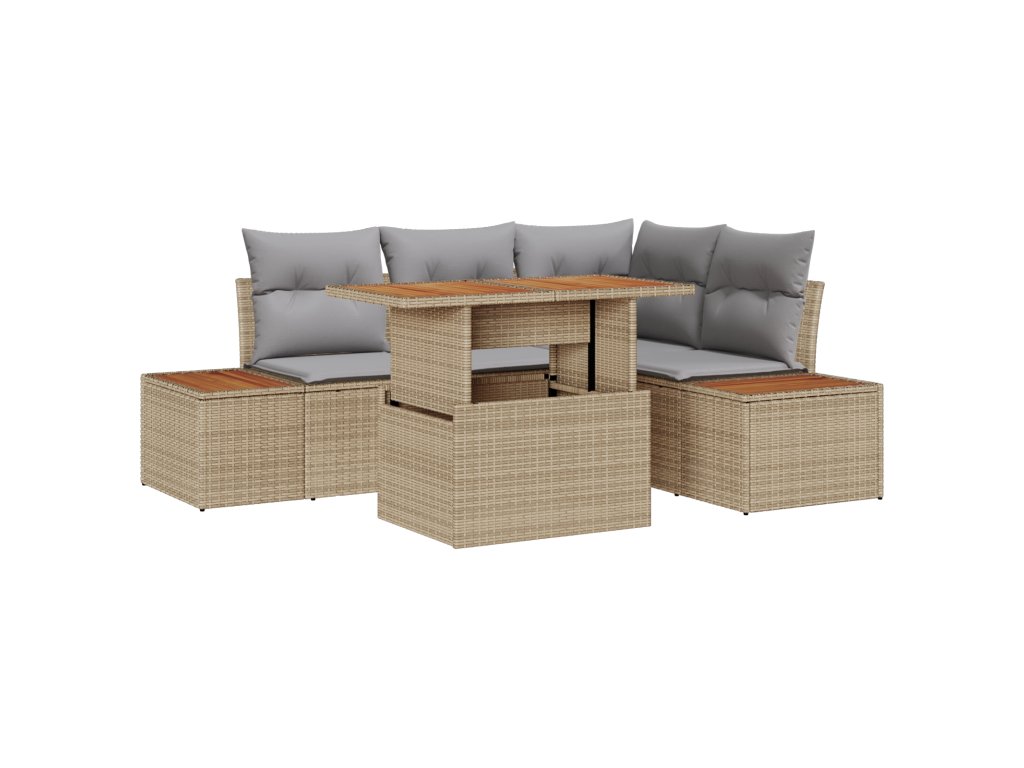 - Dodávka obsahuje: 2 x boční pohovka s úložnou funkcí, 1 x roh sedadla s úložnou funkcí, 1 x centrální sedadlo s úložnou funkcí, 1 x zahradní stůl