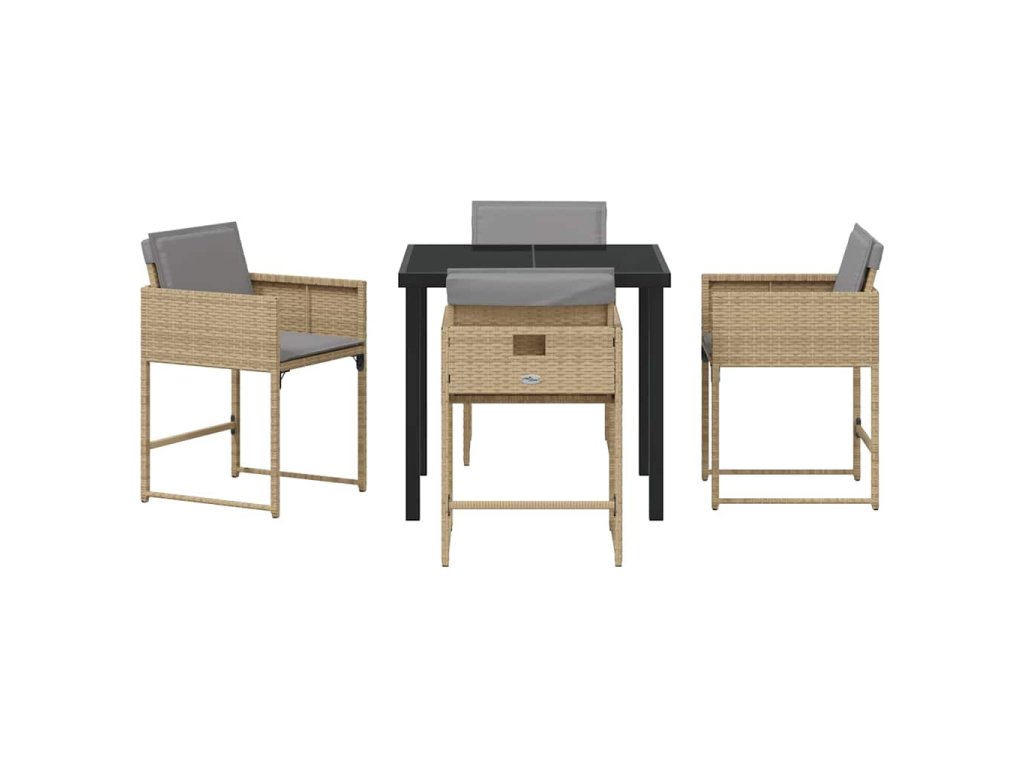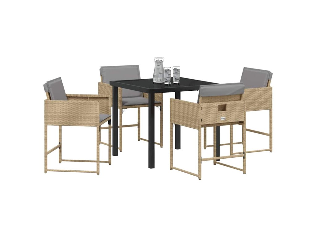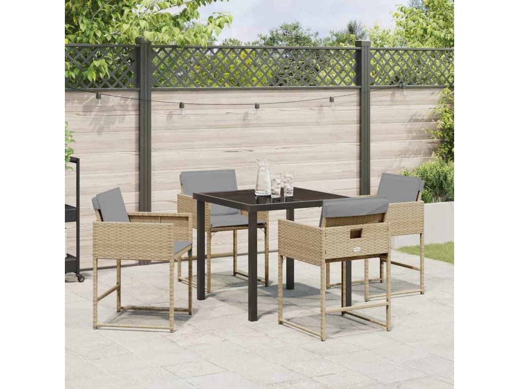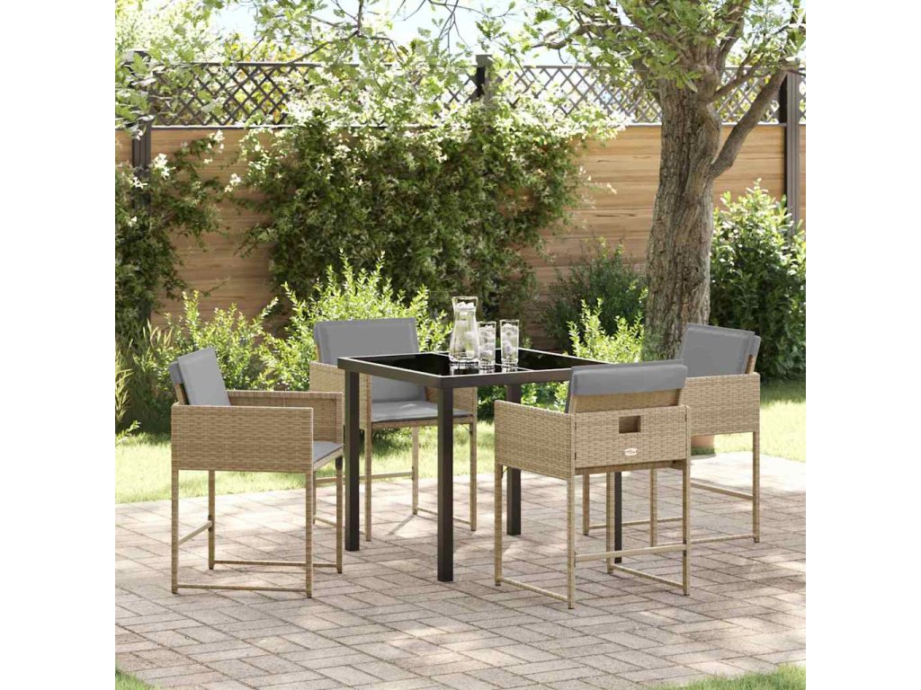 - Vysoce kvalitní materiály: Jídelní set obsahuje odolný poly ratan, který dodává sofistikovaný vzhled a zajišťuje dlouhou životnost venku. Povrch z tvrzeného skla nabízí eleganci a praktičnost, což usnadňuje čištění a údržbu. Společně tvoří vizuálně atraktivní a robustní kompozici ideální pro venkovní stolování.