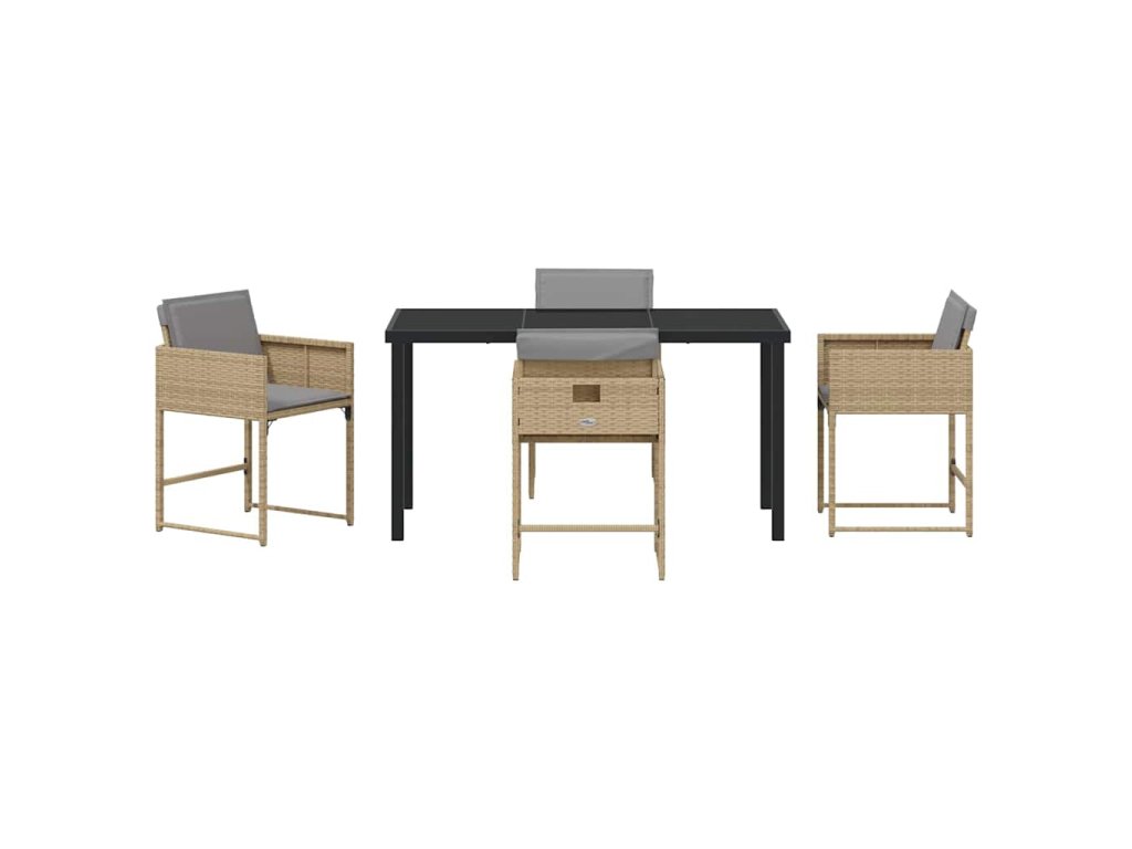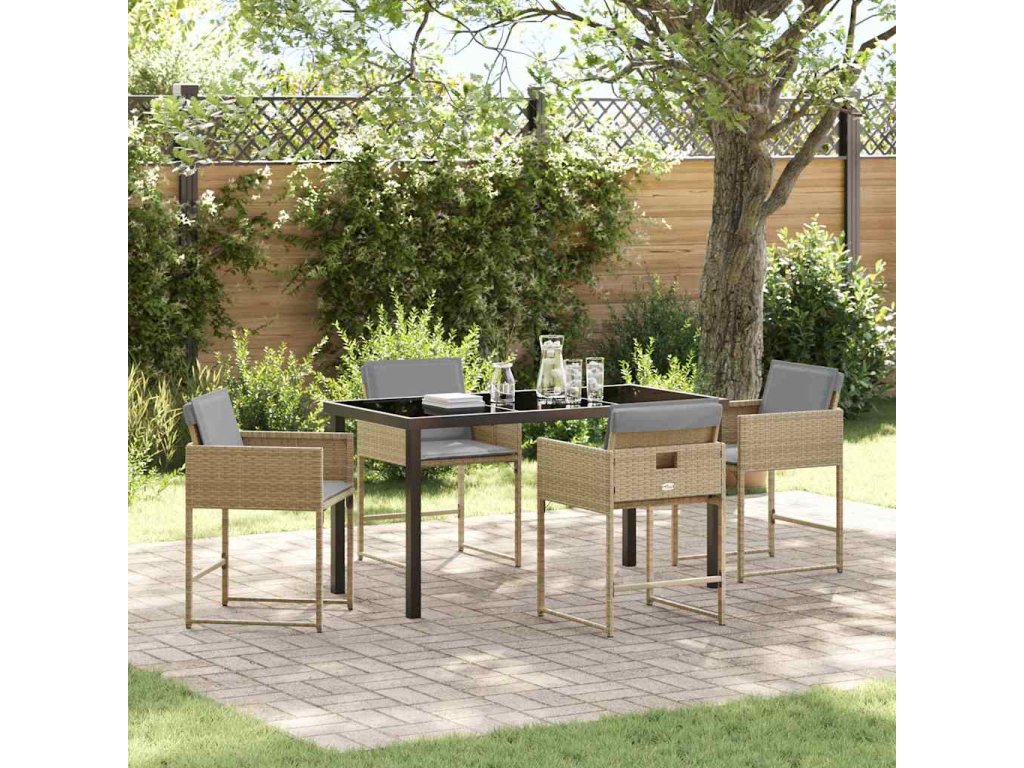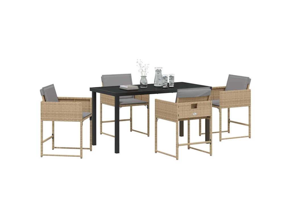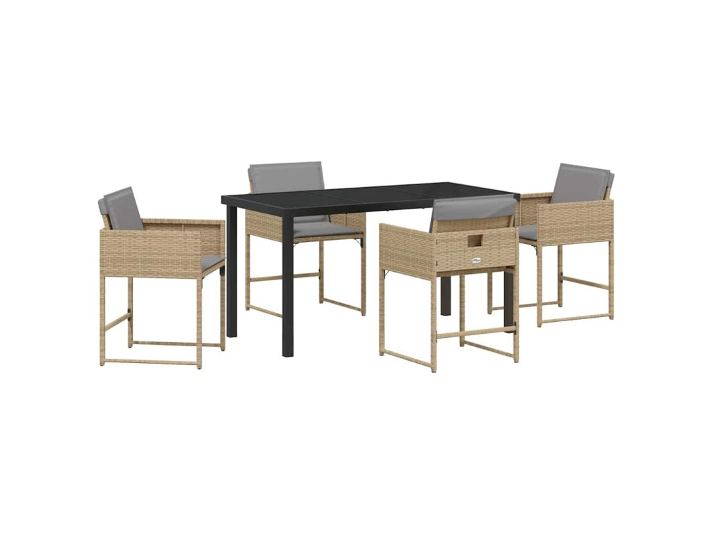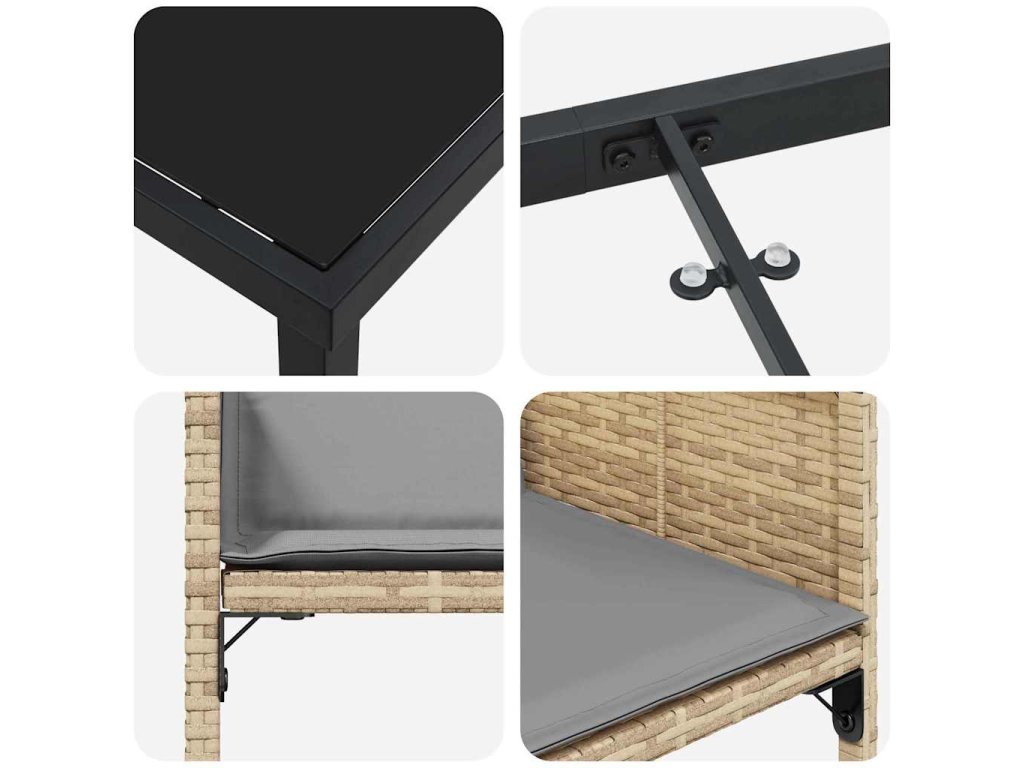 - Vysoce kvalitní materiály: Jídelní set obsahuje odolný poly ratan, který dodává sofistikovaný vzhled a zajišťuje dlouhou životnost venku. Povrch z tvrzeného skla nabízí eleganci a praktičnost, což usnadňuje čištění a údržbu. Společně tvoří vizuálně atraktivní a robustní kompozici ideální pro venkovní stolování.