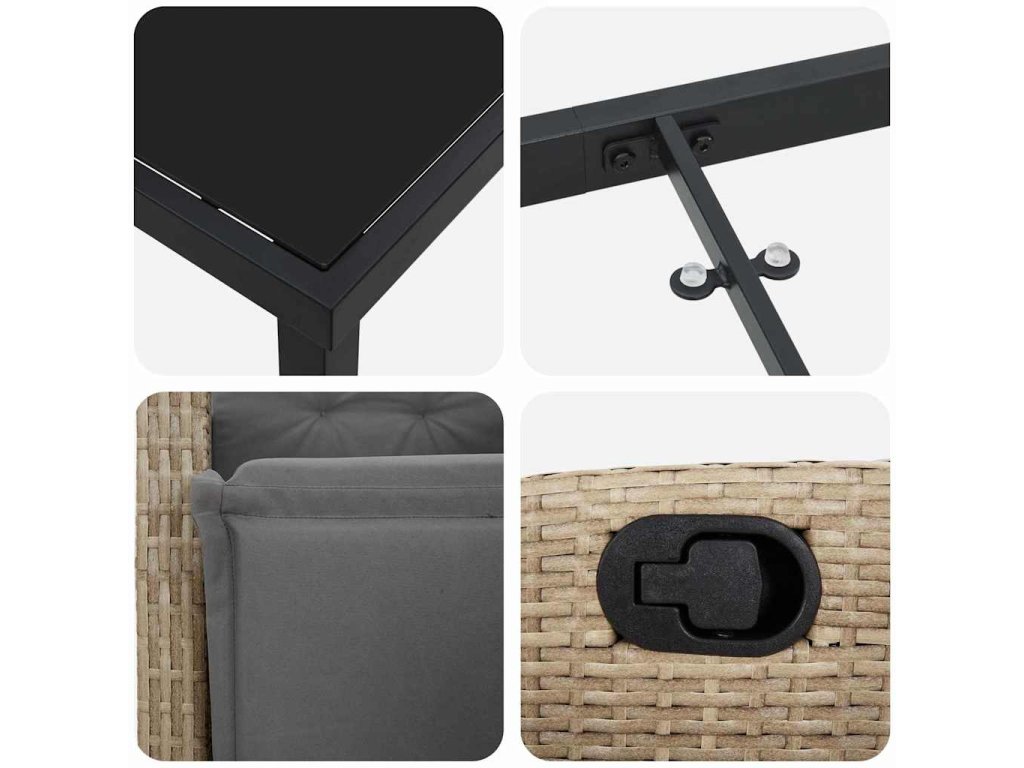- Silný materiály: Tenhle set je z kvalitního poly ratanu a oceli. Odolá počasí a je navrženej, aby vydržel, ideální pro venkovní použití. Textura poly ratanu se parádně doplňuje se stabilním ocelovým rámem, což ti zajišťuje stabilitu a styl pro každodenní zábavu.