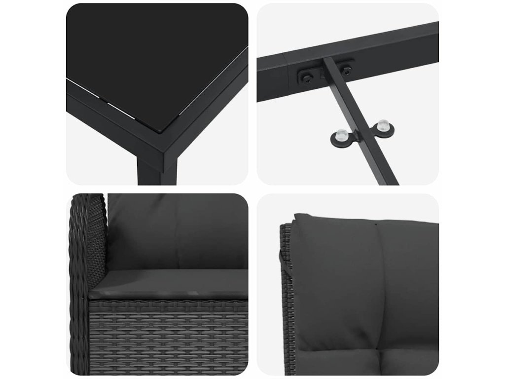 - Materiály: Vyrobený z kvalitního poly ratanu, set kombinuje sklo a práškově lakovanou ocel pro dlouhou životnost a pohodlí. Materiály jsou odolné vůči UV záření, takže si můžete být jistí jejich výdrží venku. Skleněná deska dodává elegantní a sofistikovaný vzhled, který razí čas a zátěž počasí.