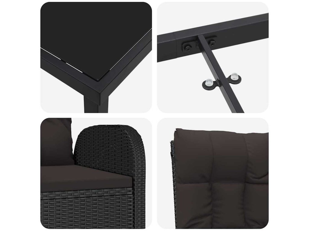 - Materiály: Hlavním materiálem je poly ratan, který odolává špatnému počasí a snadno se čistí. Díky UV ochraně si set zachová svůj vzhled sezonu co sezonu. Tvrzené sklo na stole dodává šmrnc a ladí k luxusnímu poly ratanu.