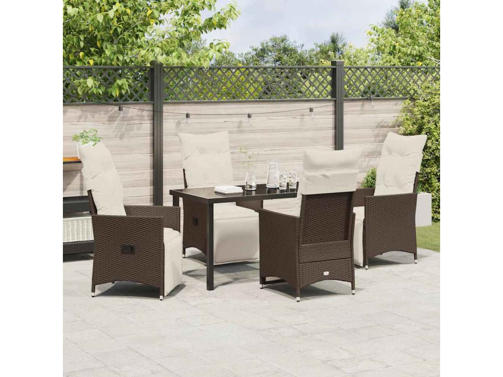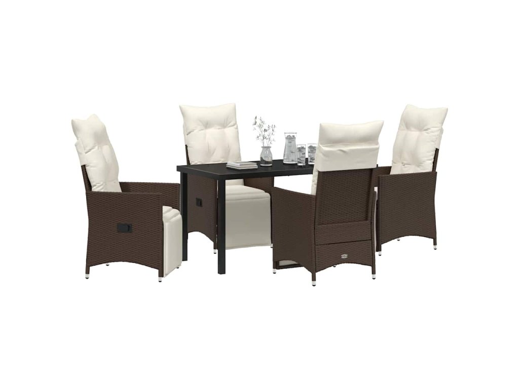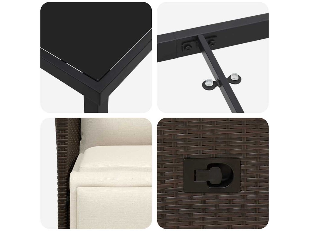 - Materiály z polyratanu Zahradní jídelní set je vyrobený z odolného polyratanu, který je UV stabilní a dlouho vydrží. Dlouho si zachovává skvělý vzhled, i za špatného počasí, takže je ideální pro venkovní použití. Textura a pocit polyratanu vytvářejí příjemnou atmosféru pro luxusní venkovní stolování.