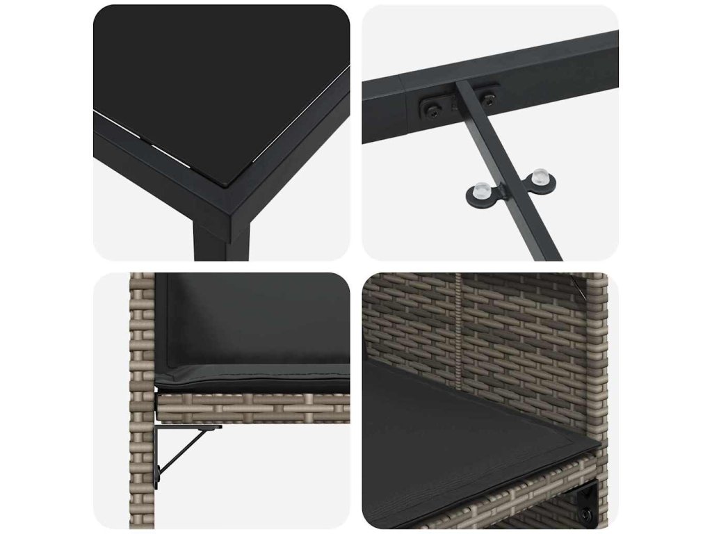 - Komponenty: Skládací prvky s praktickým klapkovým systémem na polštářích sedáku pro pohodlí, jsou vyrobeny z odolné látky pro dlouhé venkovní používání. Stůl z tvrzeného skla dodává eleganci a také zůstává praktický.