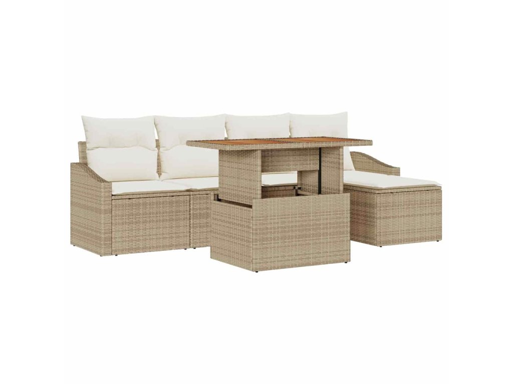 - Součásti: Sada se skládá ze dvou arm sof, dvou středových sedadel, podnožky se skladovacími schopnostmi a odpovídajícího zahradního stolu. Každý kus je dokončen poly ratanem a doplněn povrchy z akáciového dřeva.