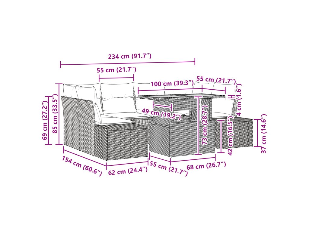 Tato 7dílná zahradní jídelní souprava spojuje chytrý design a funkční venkovní nábytek, navržený k relaxaci a zábavě. Je vyrobená z voděodolného poly ratanu a má pohodlné polštáře, které skvěle vypadají a také oživují vaši zahradu, balkon nebo zimní zahradu.