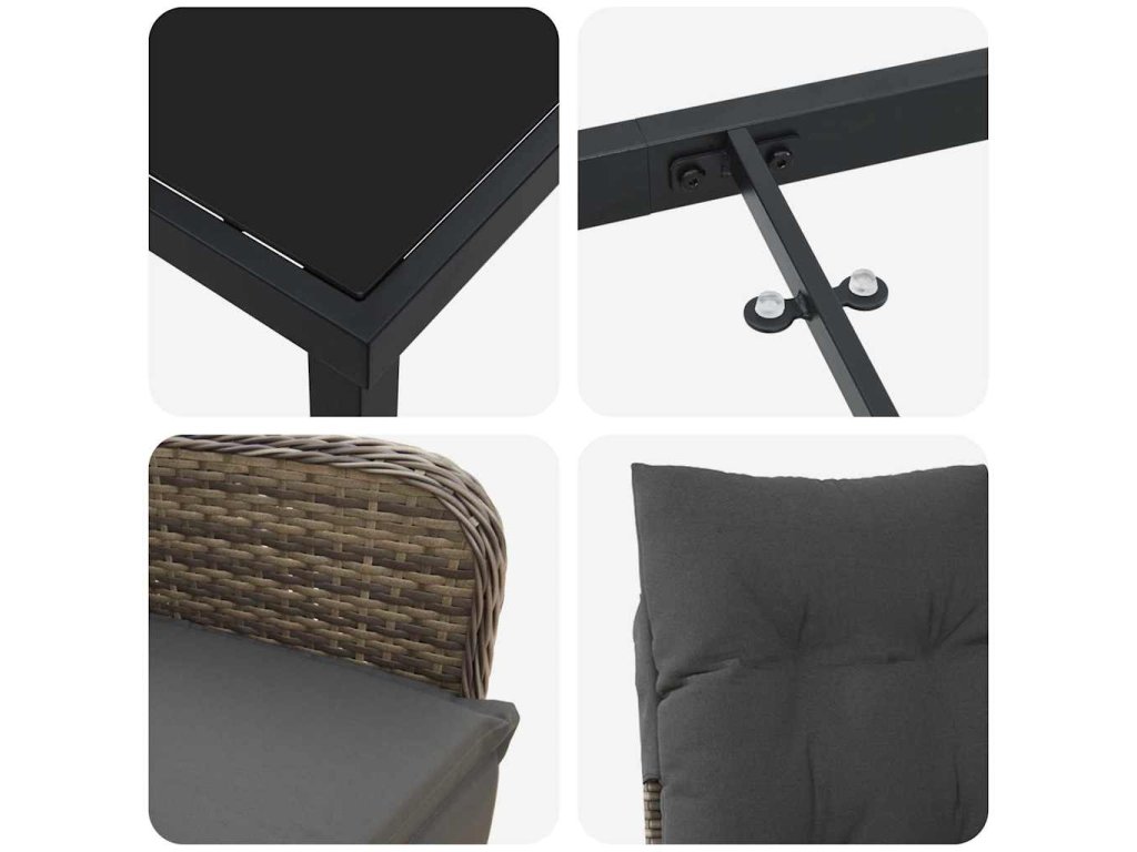 - Vysoce kvalitní materiály: Na výrobu setu byly použity poly ratan, tvrzené sklo a práškově lakovaná ocel. Tento set spojuje styl s odolností. Poly ratan navíc chrání proti UV záření, což prodlužuje dobu jeho atraktivity a funkčnosti. Práškově lakovaná ocel přináší pevnou oporu pro venkovní použití.