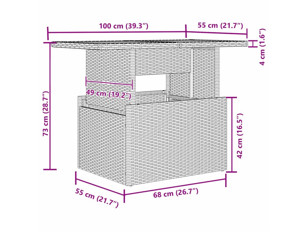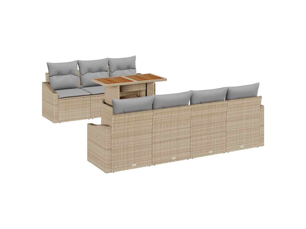 - Odolná konstrukce: Vyrobeno z kvalitních materiálů, včetně poly ratanu, práškově lakované oceli a masivního dřeva akácie. Tyto materiály zajišťují pevnost vůči venkovním prvkům, poskytující robustnost pro všechna roční období. Tato kombinace materiálů nejenže přispívá k odolnosti, ale také zvyšuje vzhled moderním vzhledem.