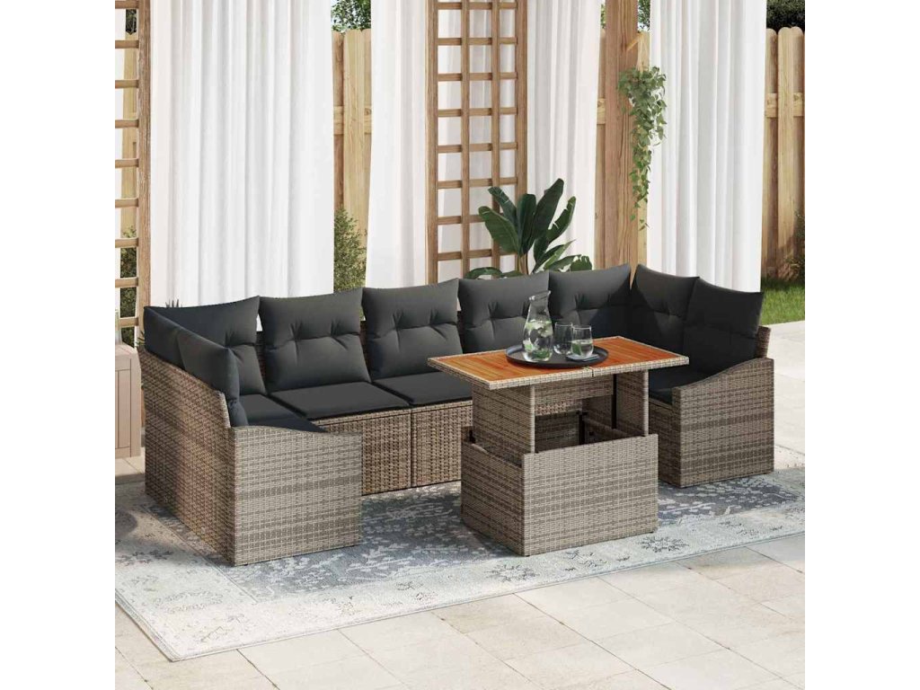 - Komplexní komponenty: Sada zahrnuje různé možnosti sezení, jako jsou křesla a rohové sedačky, vhodné pro malé i velké skupiny. Robustní stůl vyrobený z masivního akáciového dřeva stojí uprostřed a poskytuje stabilní plochu pro jídla a setkání.