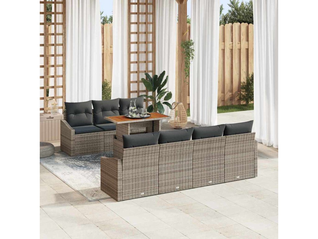 Tato zahradní jídelní sada spojuje moderní styl s praktičností, což z ní dělá skvělý doplněk každého venkovního prostoru. Je vyrobená z odolného polyratanu a dřeva, má texturovaný povrch a pohodlné polštáře, které vytvářejí příjemnou atmosféru pro odpočinek nebo setkání.