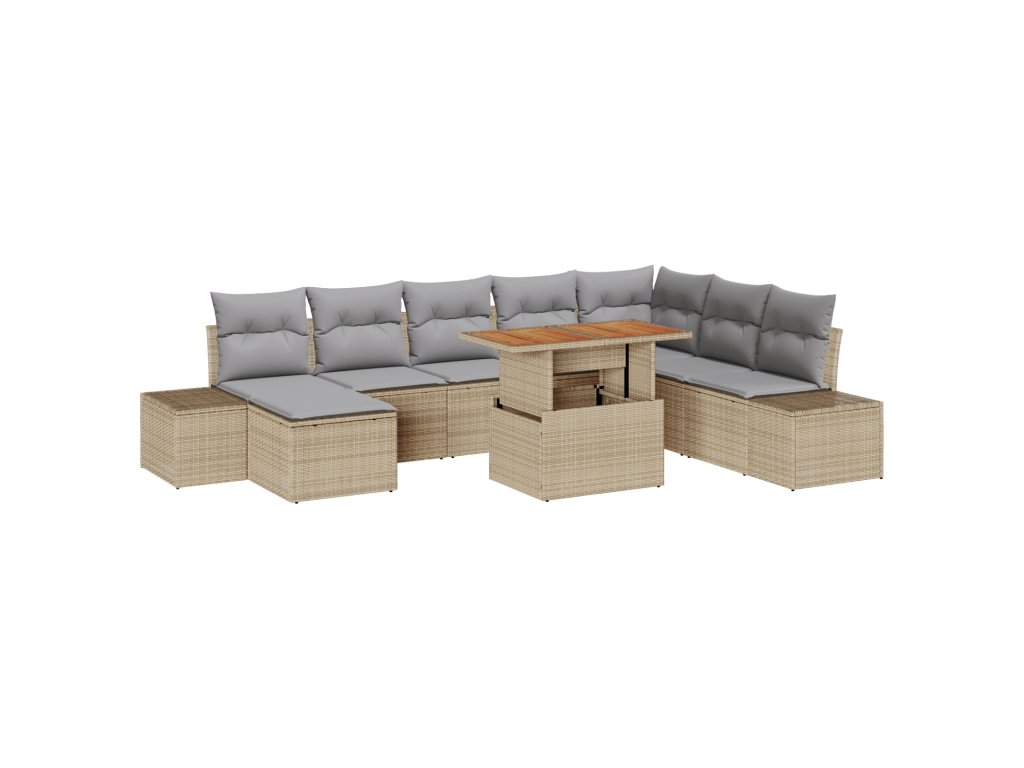 - Obsah balení: 2x boční pohovka s úložným prostorem, 1x rohové sedadlo s úložným prostorem, 4x centrální sedadlo s úložným prostorem, 1x taburet s úložnou funkcí, 1x zahradní stůl