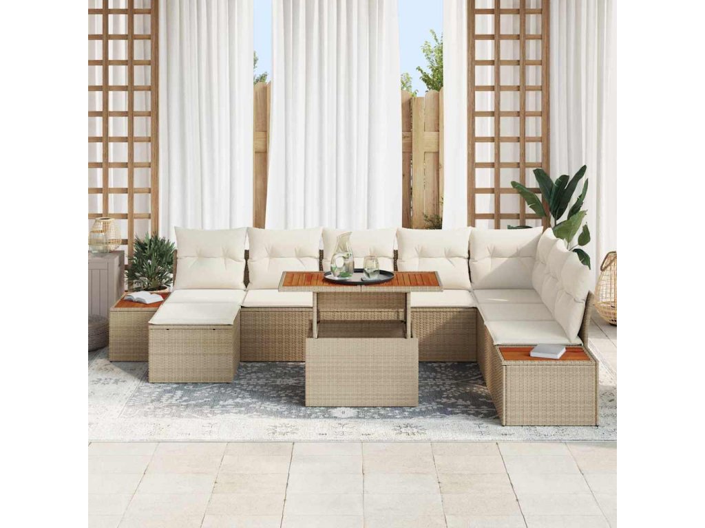 Materiály: Jídelní set je vyroben z trvanlivého poly ratanu, který odolává UV záření a nepříznivým povětrnostním podmínkám. Rám z práškově lakované oceli zajišťuje stabilitu a spolehlivou podporu, zatímco pevný stůl z akáciového dřeva vyzařuje přirozené kouzlo, které zvyšuje jeho vzhled proti odolné ratanové struktuře.,Zahrnuté komponenty: Tato souprava zahrnuje 2 boční pohovky, roh, 4 střední sedáky, taburet a zahradní stůl, každý s vestavěným úložným prostorem. Tyto komponenty umožňují snadné uspořádání doplňků a poskytují bezproblémovou variabilitu v uspořádání vaší zahrady pro různé sociální situace a účely.,Funkce / Design: Užívejte si flexibilitu s nastavitelnými nožičkami, které se přizpůsobí nerovným povrchům a zajistí stabilní jídelní zážitek. Moderní design integruje matný povrch, který zvyšuje estetiku a maximalizuje využití vašeho venkovního prostoru.,Doporučené použití: Ideální pro venkovní stravování za slunečných jarních a letních dnů, modulární povaha tohoto jídelního setu umožňuje snadné přizpůsobení pro různé velikosti skupin. Je perfektní pro rodinné grilování, pořádání přátel nebo prostě pro relaxaci s knihou.,Údržba: Aby se prodloužila životnost tohoto setu, zakryjte ho a nechte uschnout, když ho nepoužíváte. Pravidelné čištění suchým hadříkem udržuje vzhled čerstvý, zajišťující, že zůstává atraktivním středobodem vaší zahrady po mnoho let.- Barva: Béžová a krémová