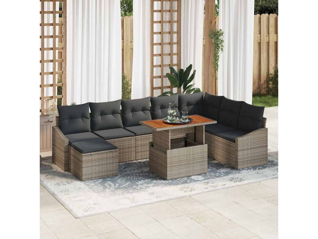Tato zahradní jídelní sada mixuje styl s praktickými výhodami, což ji dělá ideální pro venkovní odpočinek. Devítikusová sada zahrnuje rohovou pohovku, středové sedáky a krásný zahradní stůl, vše navržené tak, aby vylepšilo tvůj venkovní život a nabídlo dostatek místa na sezení a úložiště.