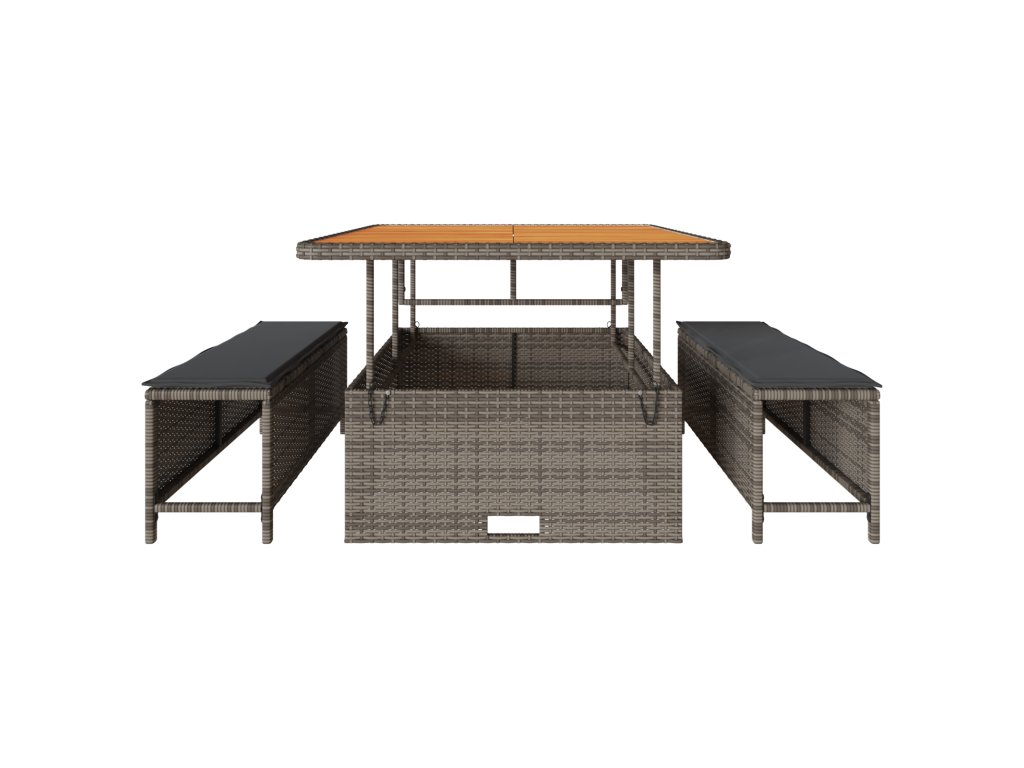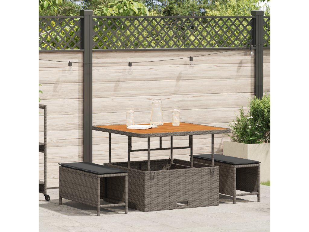 Tento venkovní jídelní set je skvělý mix stylu a praktičnosti, perfektní pro terasy a balkony. Obsahuje obdélníkový stůl a dvě stoličky, ideální pro blízké stolování, skvěle se hodí do okolí a dodává moderní styl.