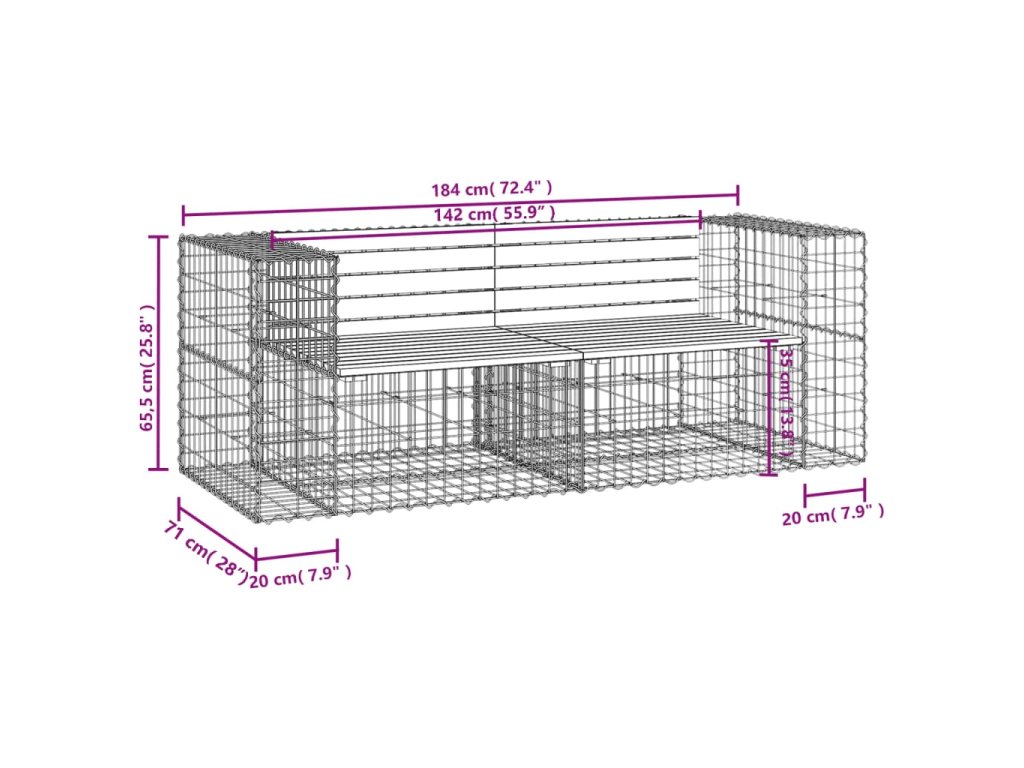 - Robustní a stabilní základna: Venkovní lavice je vybavena základnou z pozinkovaného ocelového gabionového koše, který je navržen tak, aby jej bylo možné naplnit kameny a štěrkem pro atraktivnější vzhled. Mřížku gabionového koše tvoří podélné a svislé drátky, které jsou navíc v každém spoji svařené pro lepší stabilitu.