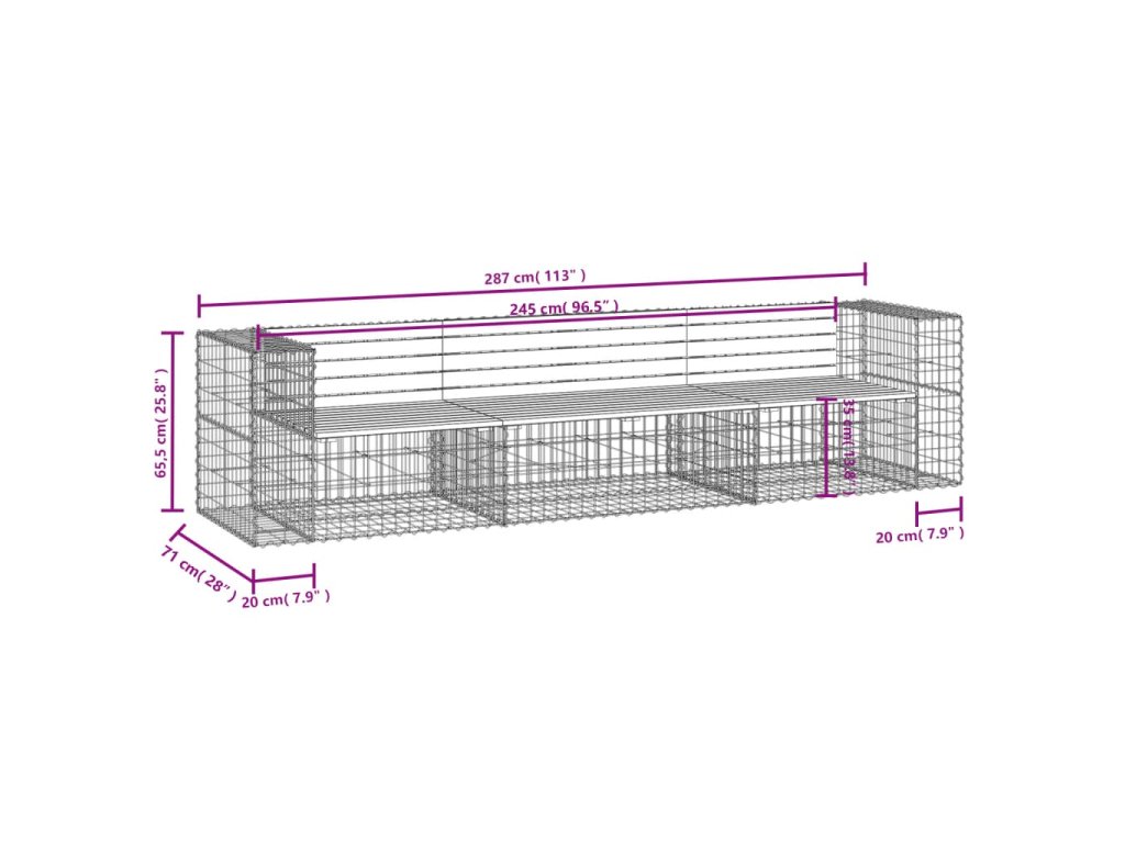 - Robustní a stabilní základna: Venkovní lavice je vybavena základnou z pozinkovaného ocelového gabionového koše, který je navržen tak, aby jej bylo možné naplnit kameny a štěrkem pro atraktivnější vzhled. Mřížku gabionového koše tvoří podélné a svislé drátky, které jsou navíc v každém spoji svařené pro lepší stabilitu.