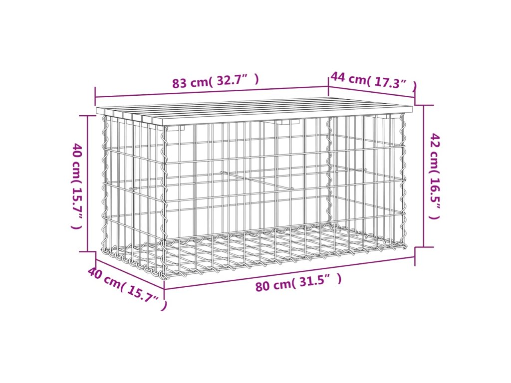 - Robustní a stabilní základna: Tato venkovní lavice je vybavena základnou z pozinkovaného ocelového gabionového koše, který je navržen tak, aby jej bylo možné naplnit kameny a štěrkem pro atraktivnější vzhled. Mřížku gabionového koše tvoří podélné a svislé drátky, které jsou navíc v každém spoji svařené pro lepší stabilitu.