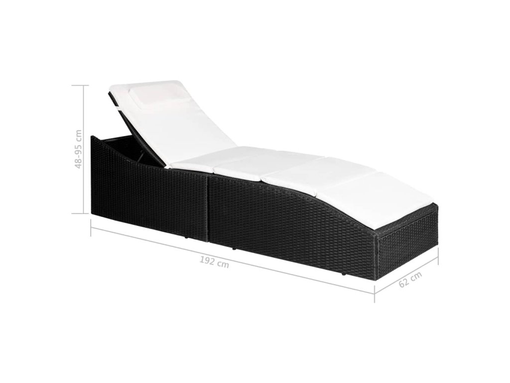 Naše opalovací lehátko je vyrobené z voděodolného polyratanu, který se snadno čistí, je odolný a má dlouhou životnost, lehátko je tudíž vhodné pro každodenní použití. Stabilitu a odolnost lehátka také zajišťuje velmi pevný rám, zhotovený z oceli ošetřené práškovým nástřikem. Podhlavník lehátka lze zvednout nahoru a nastavit jej do takové polohy, která je vám právě nejpohodlnější, ať už vsedě nebo v leže. Silně polstrovaná odnímatelná poduška s pěnovou výplní vám poskytne maximální pohodlí. Její polyesterový potah se snadno udržuje, je snímatelný a lze jej prát v pračce. Pokud lehátko právě nepoužíváte, můžete ho složit. Jeho sestavení je jednoduché. Balení obsahuje 1 opalovací lehátko a 1 velkou podušku.