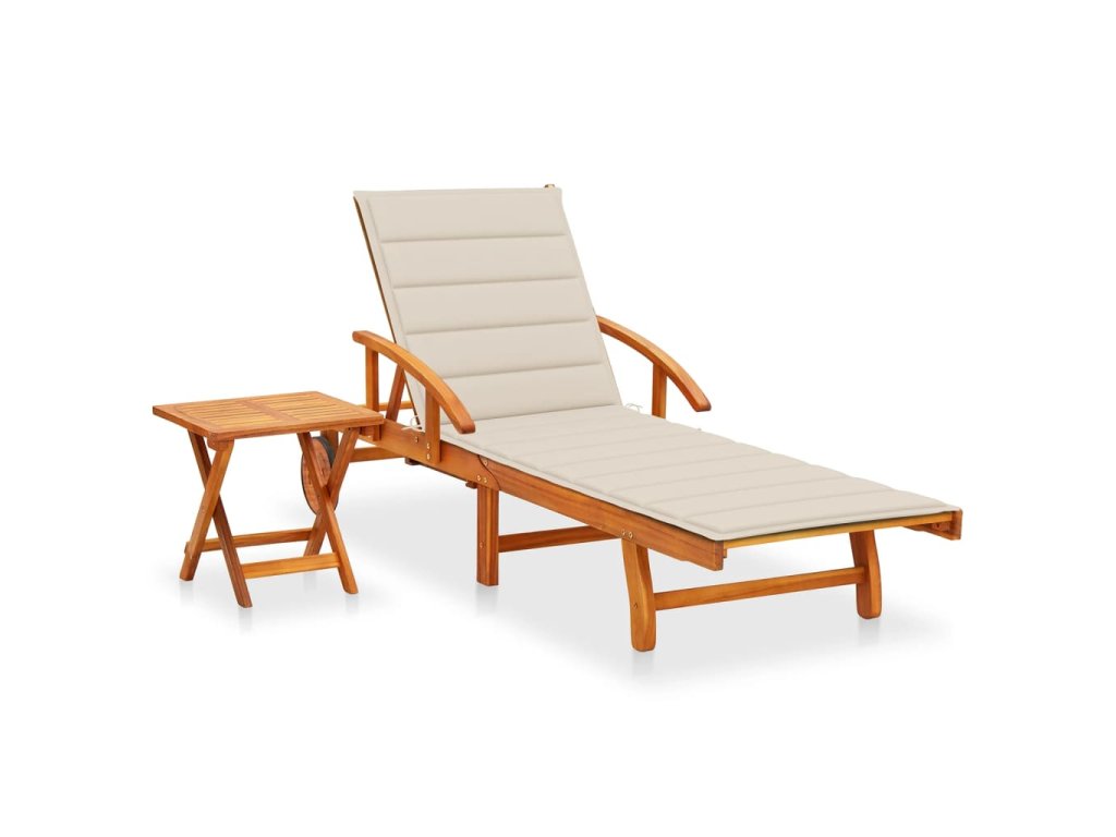 Zahradní lehátko i stolek jsou vyrobené z masivního akáciového dřeva, takže jsou bytelné a stabilní. Lehátko má 2 kolečka, po kterých se dá snadno přemisťovat. Opěradlo a opěrka nohou jsou nastavitelné, abyste si ho mohli zajistit v požadované poloze. Výsuvný odkládací stolek je perfektním místem pro telefon, sluneční brýle, nápoje a další drobné předměty. Poduška přináší extra dávku komfortu pro chvíle odpočinku. Každou podušku můžete k lehátku pevně přivázat šesti páry provázků.